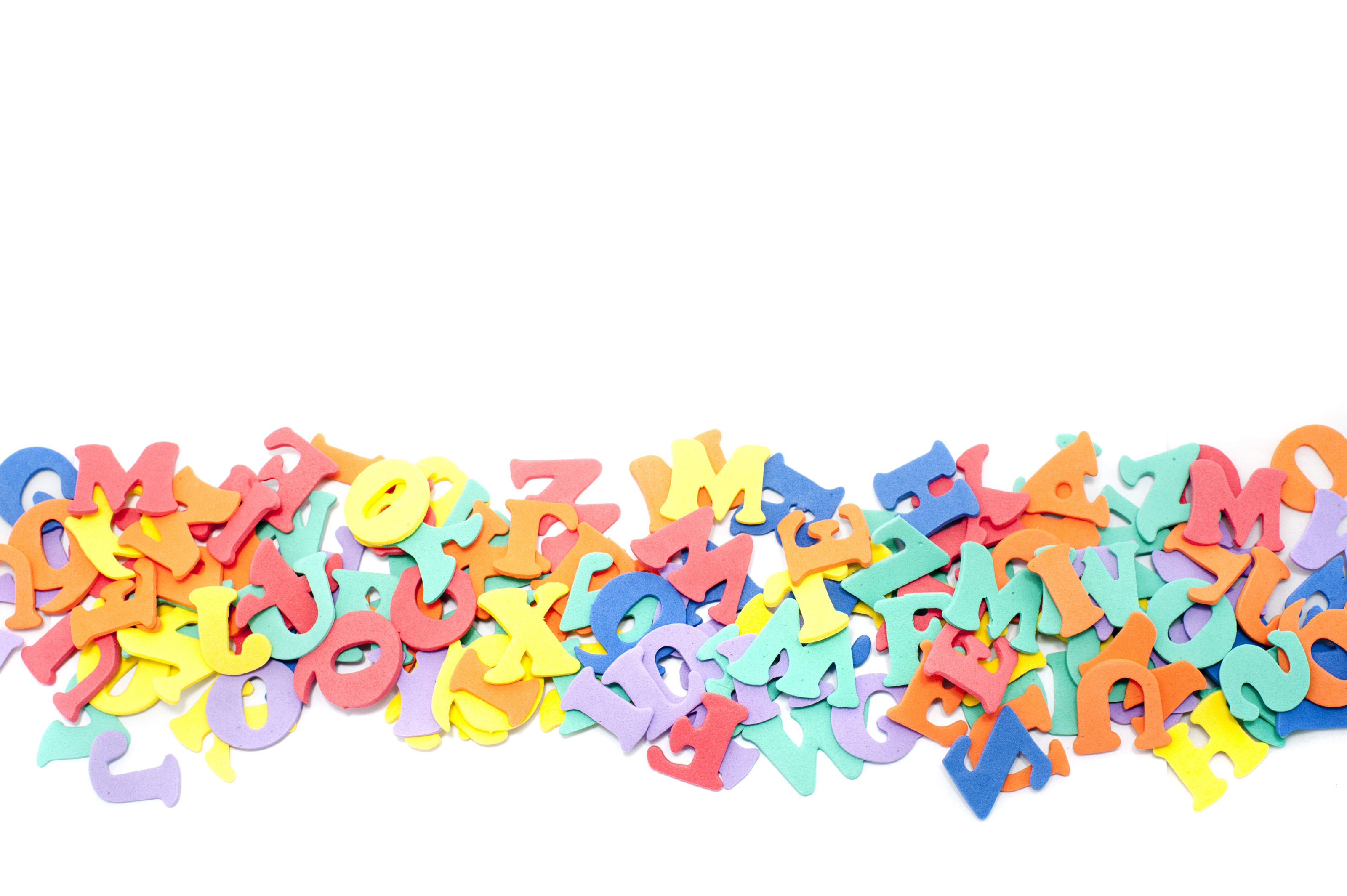 Line of jumbled colourful alphabet letters lying on a white background with copyspace for your education concept