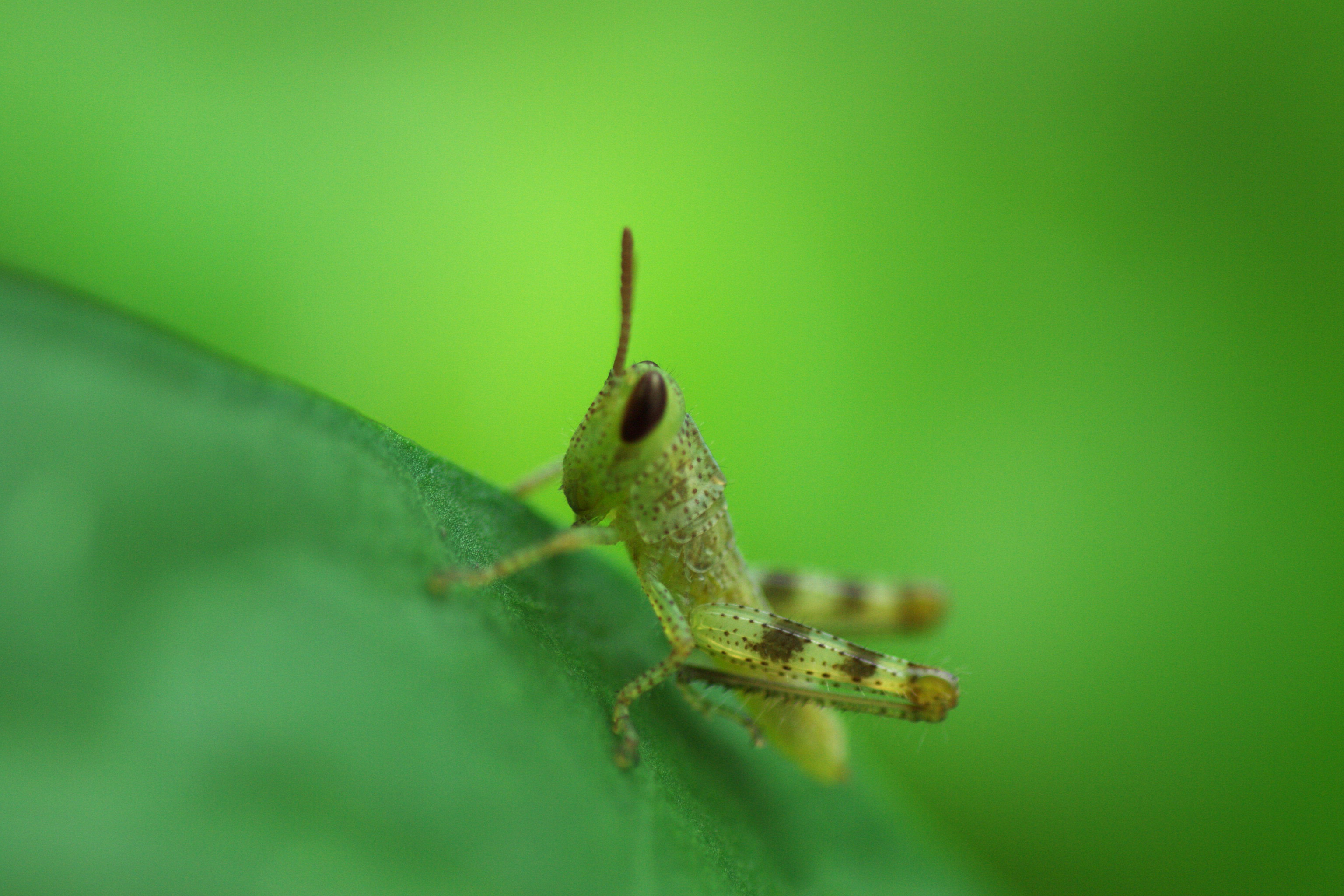 extreme close up on a tiny green coloured small locust on a leaf