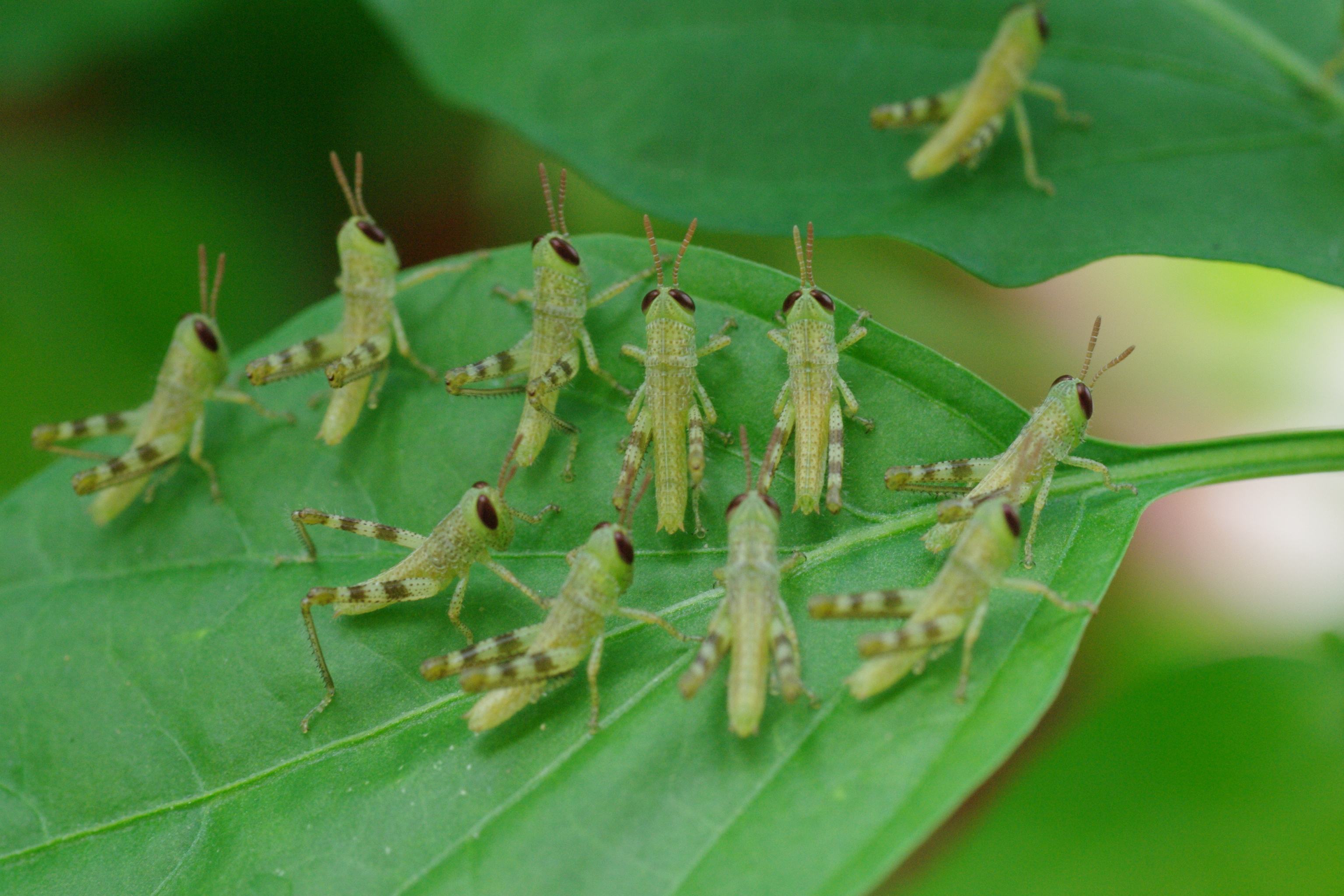 a group of small green coloured locust resting on a leaf