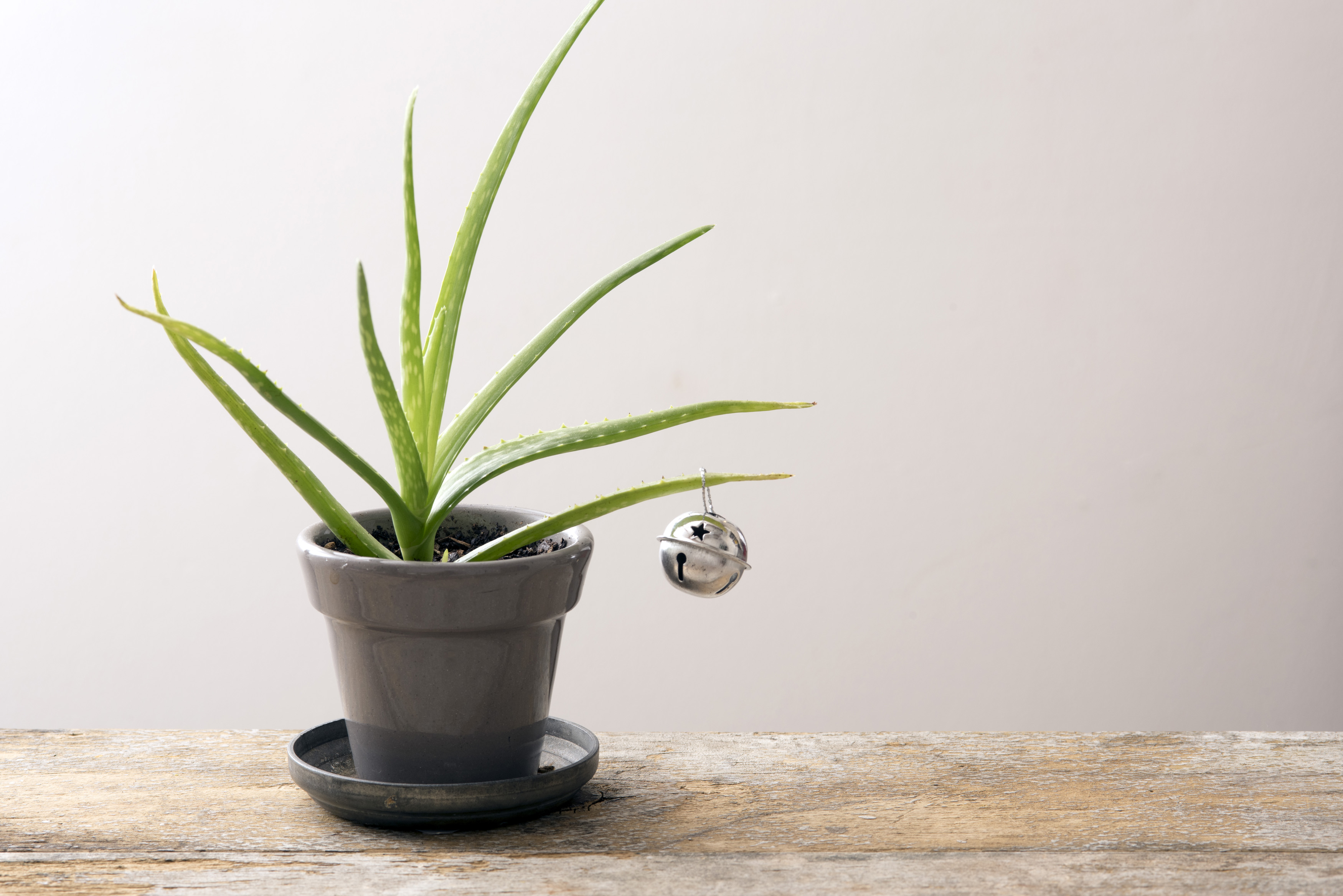 an aloe plant with a single christmas bell, concept of an austere christmas
