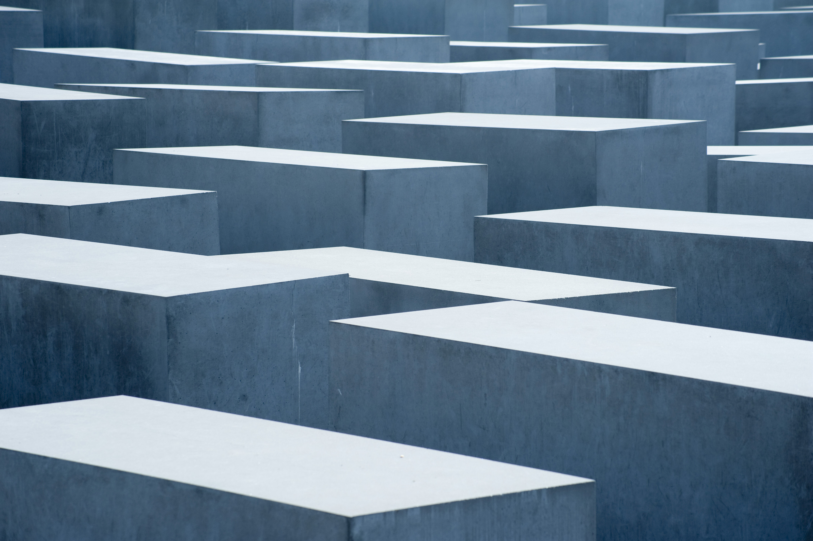 a somber image of the berlin holocaust memorial, a vast array of featureless stone blocks