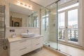 Modern apartment bathroom interior with a glass shower cubicle, basin and wonderful city view through the window