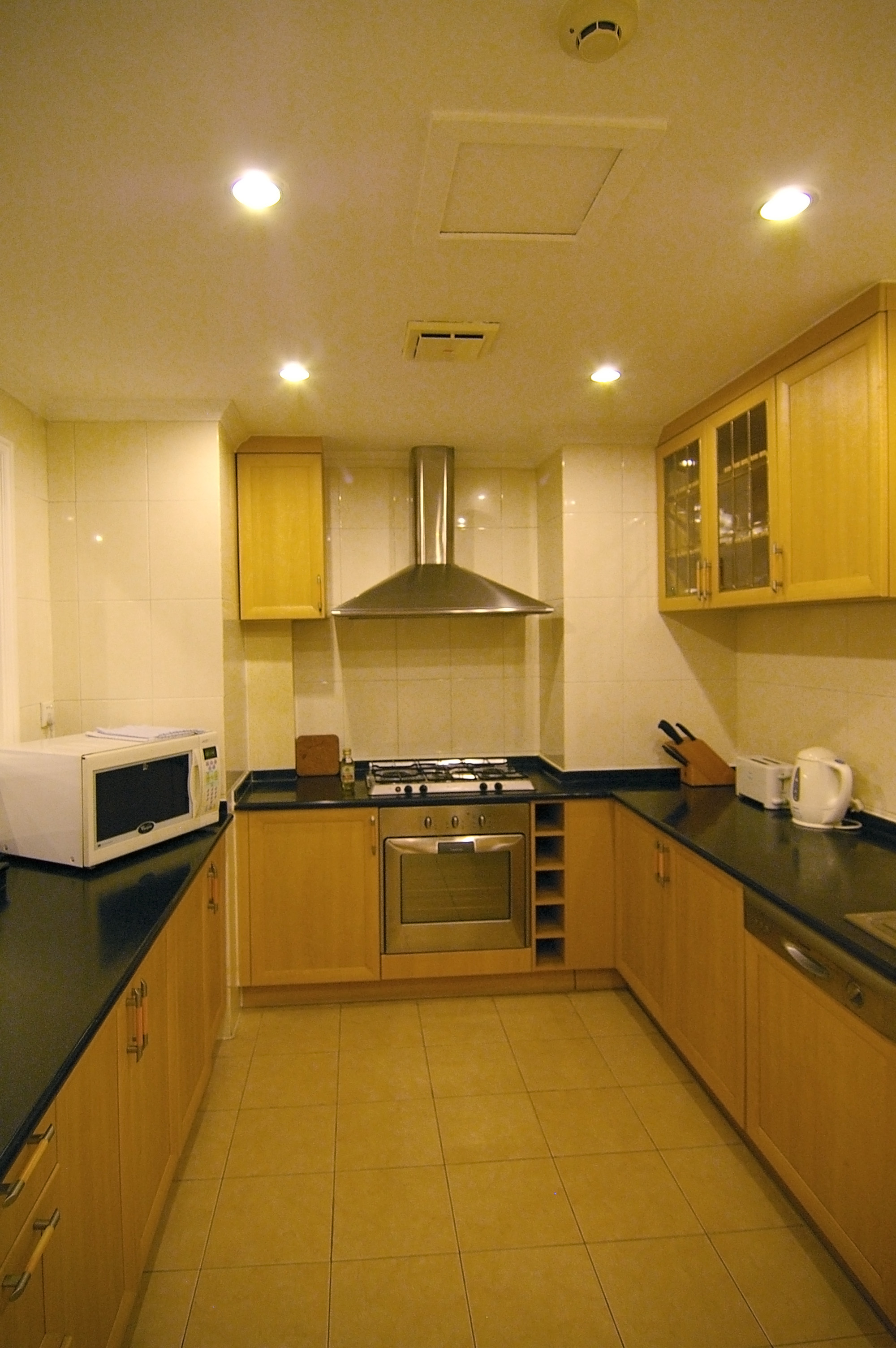 Keywords: stainess, steel, kitchen, white goods, microwave, oven, halogen, marble, black, tiles, smoke detector