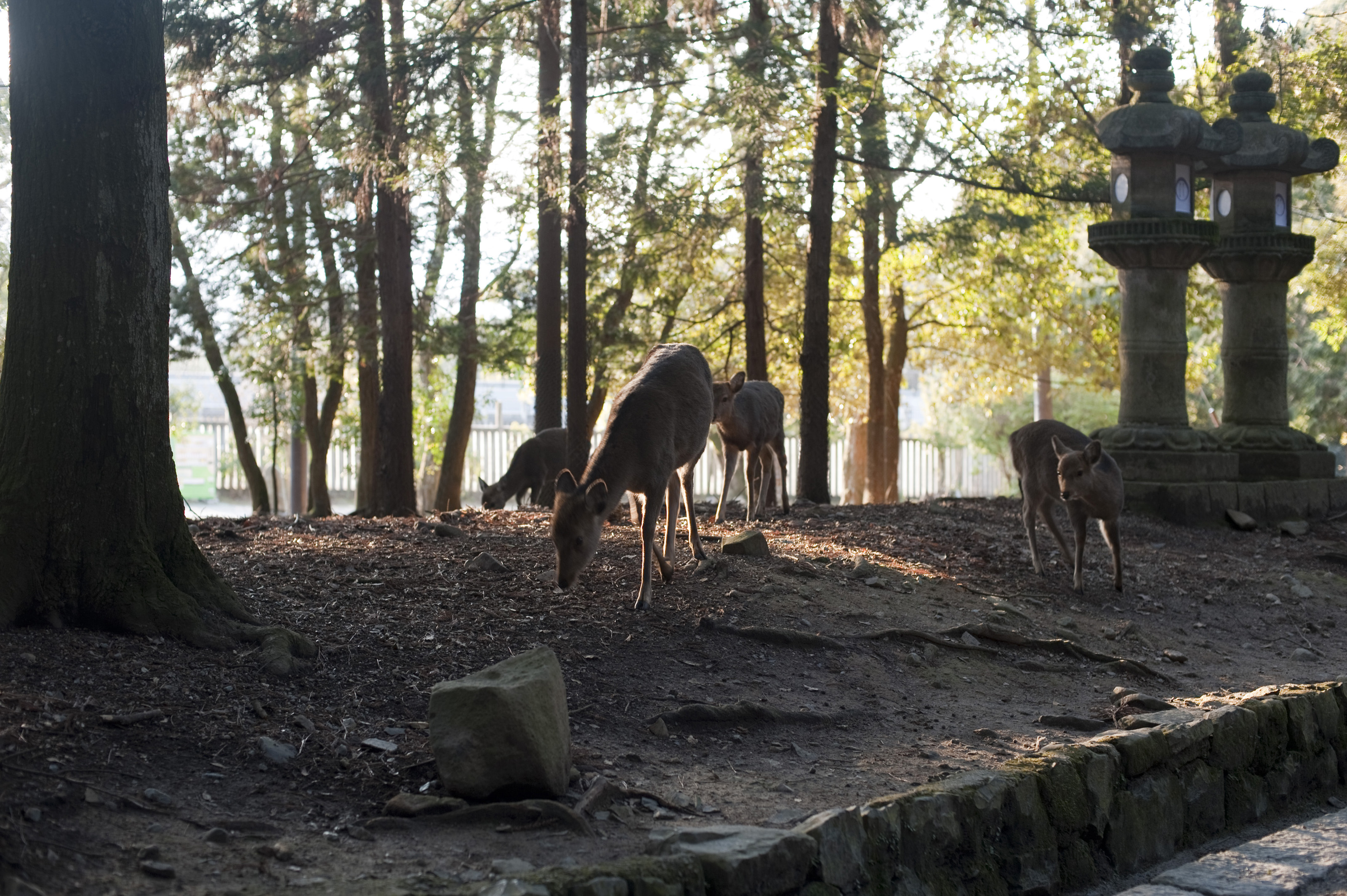 Keywords: nature, wildlife, silhouette, woodland, wild, tourism, stone, park, deer, animals, grazing, sika, protected, shrine, sacred, herd, japan, lanterns, roaming, nara