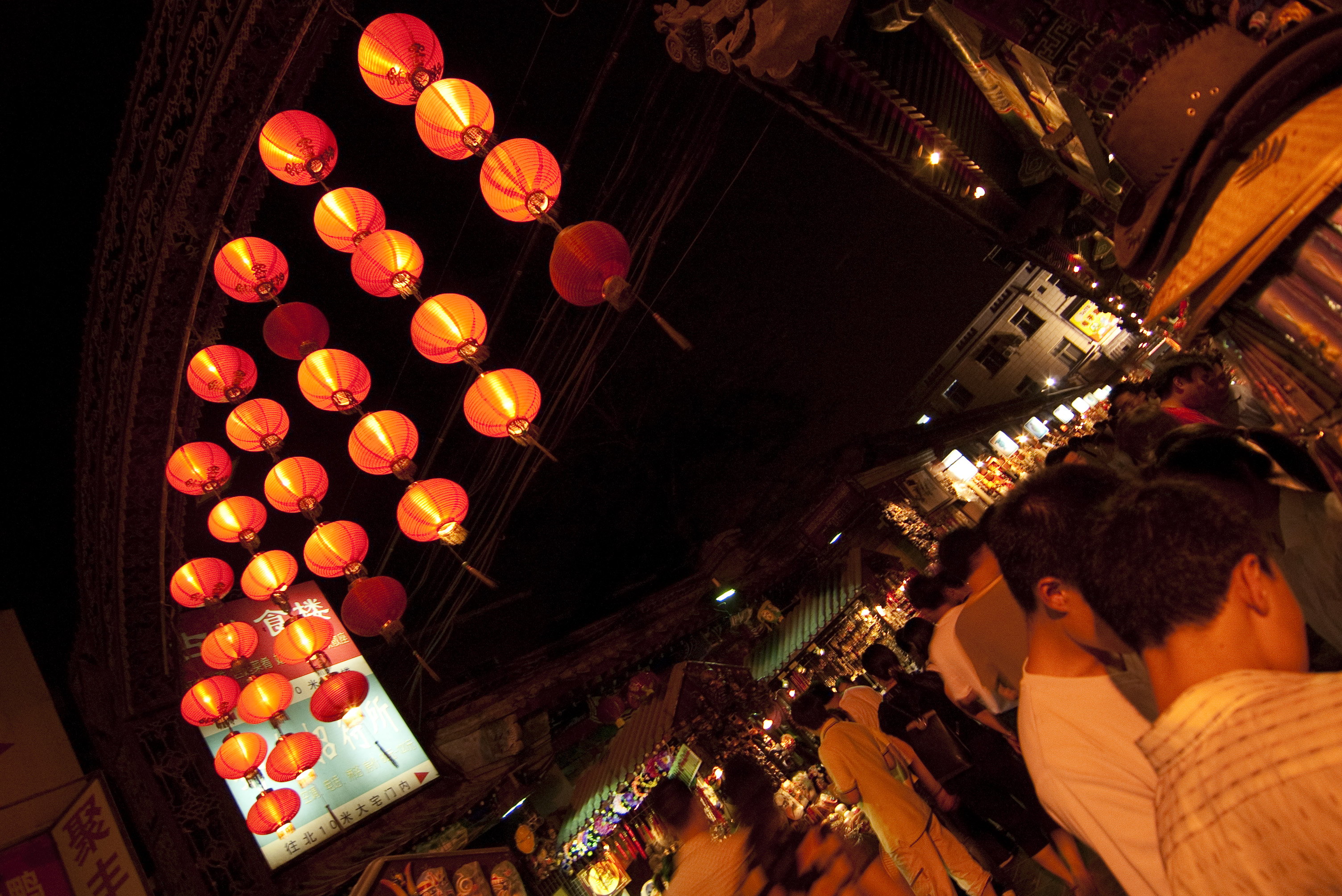 Keywords: market, night, china, red, orange, glow, bustle, busy, angle, oblique, people, shoppers, shopping, travel