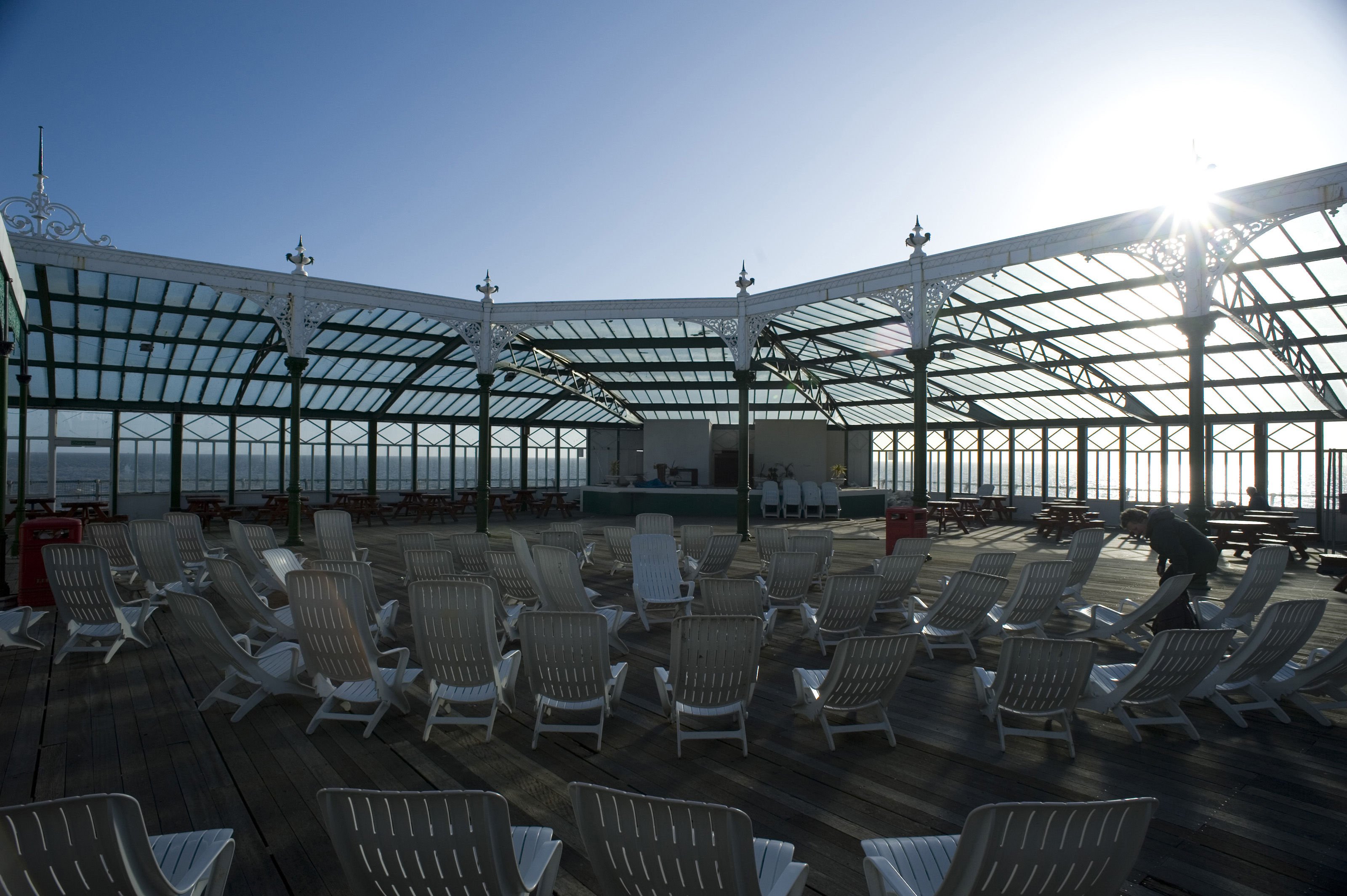 Sun loungers and seating on the decking of the Blackpool North Pier for relaxing and enjoying the blue sky and sunshine