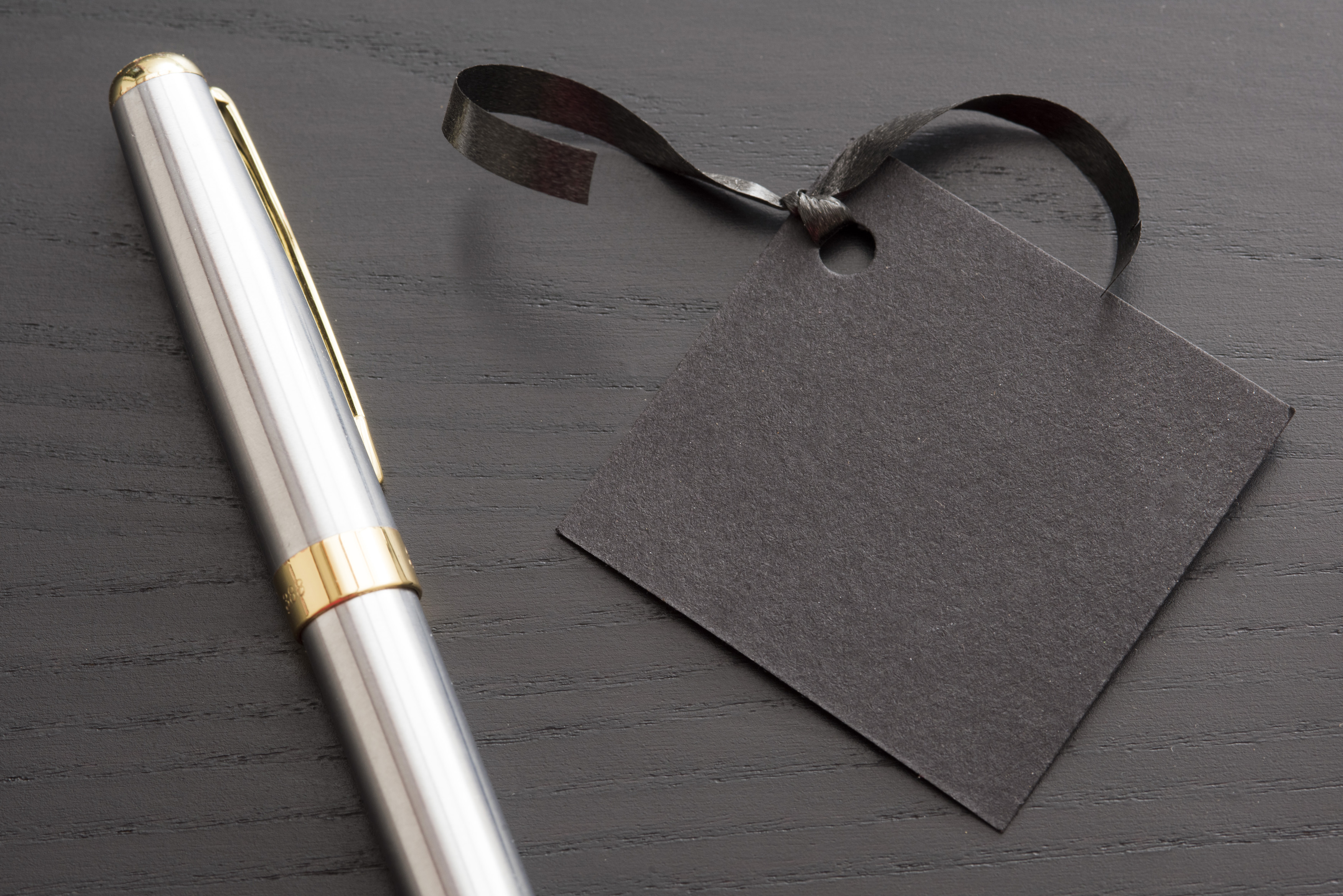 a blank black coloured gift tag and ribbon with a pen waiting to be written