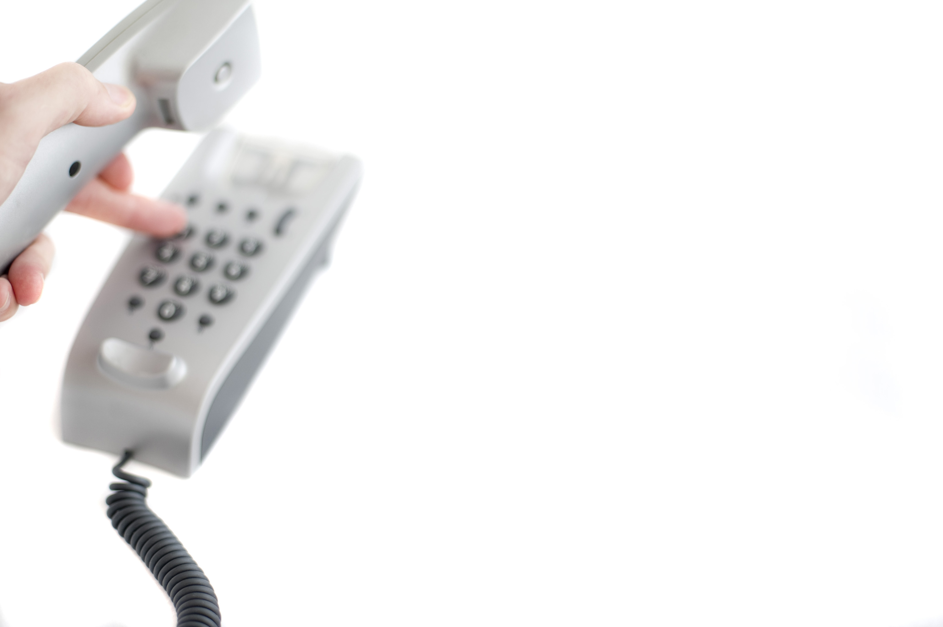 a hand dialing a number of a push button phone pictured in a high key style with a narrow depth of field