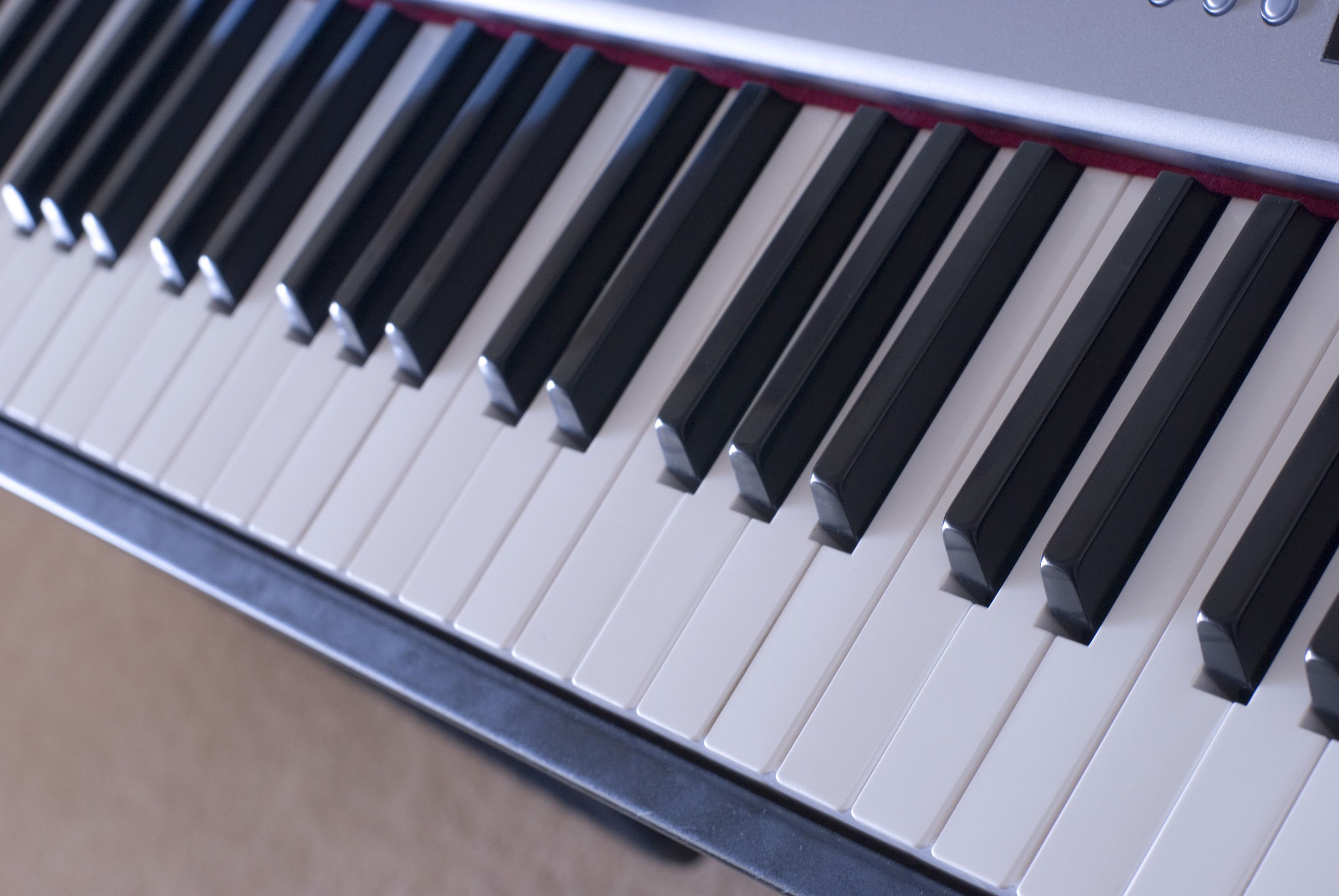 keys on a piano keyboard pictured at 45 degrees