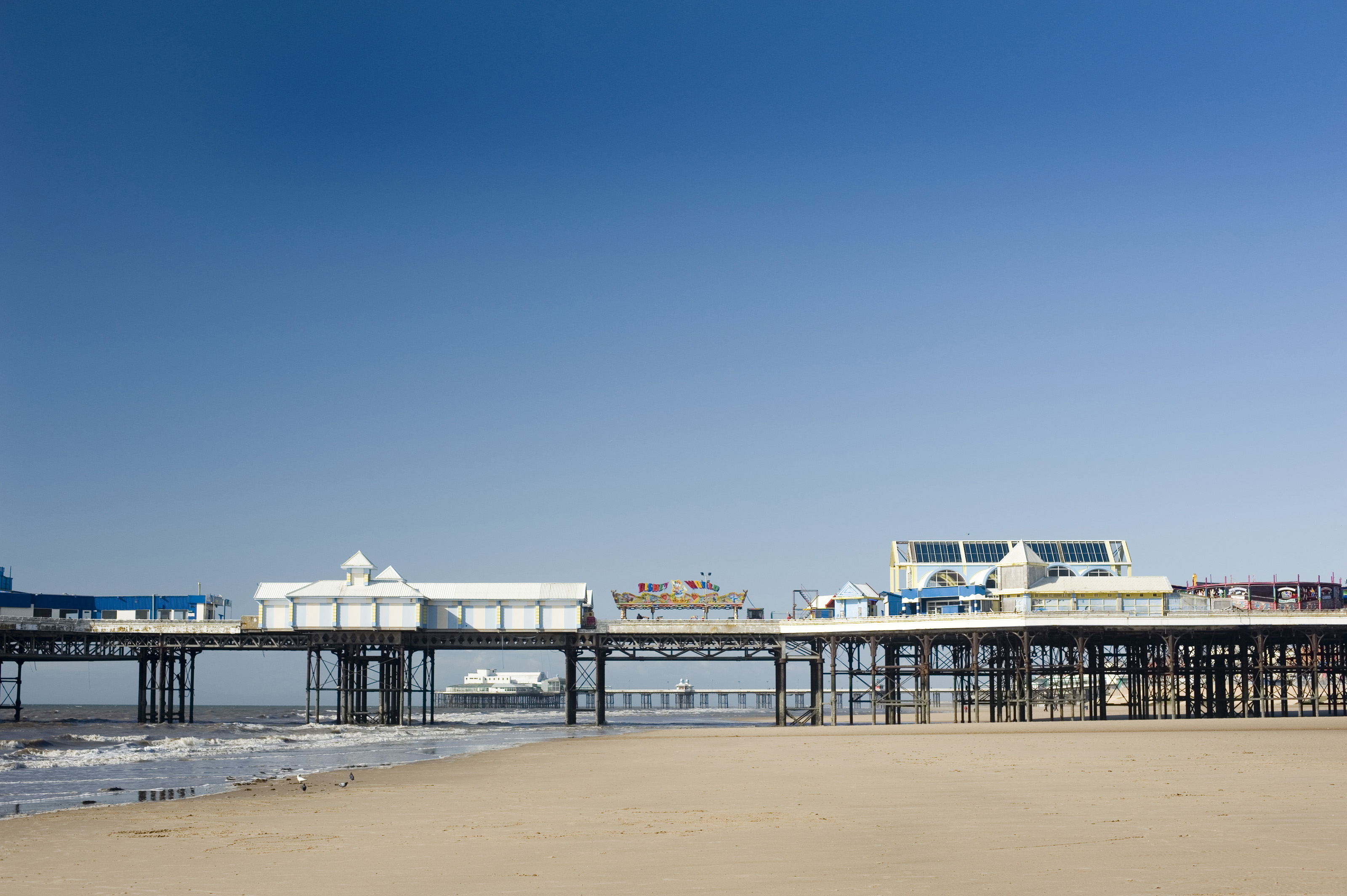 View across the deserted sandy beach to the Blackpool central pier with plenty of copyspace in a clear sunny blue sky