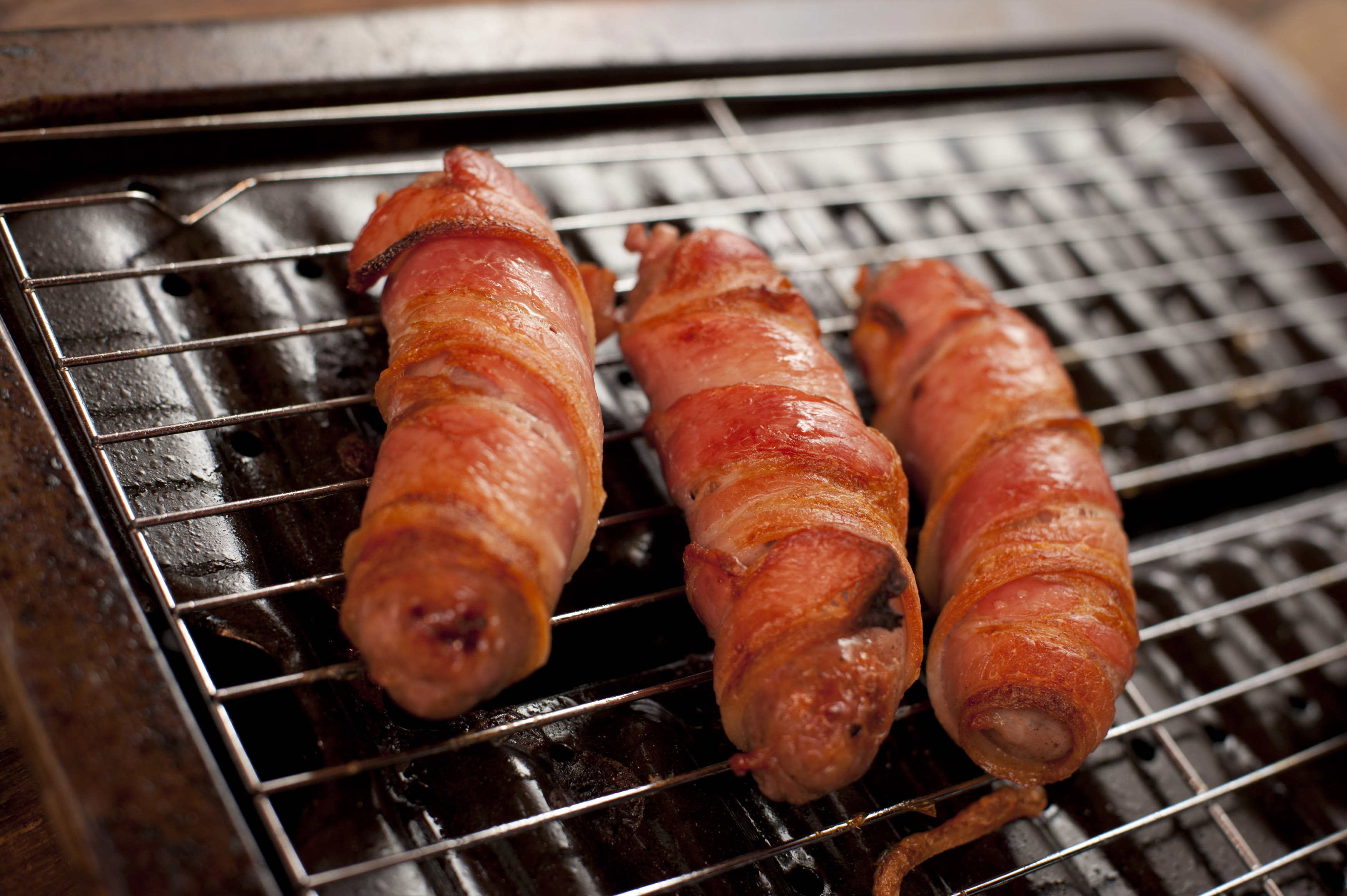 Keywords: food, meat, bacon, pigs in blankets, rolled, sausages, wrapped, grill, roast, rashers, cooked, roasting pan, three, pork, traditional