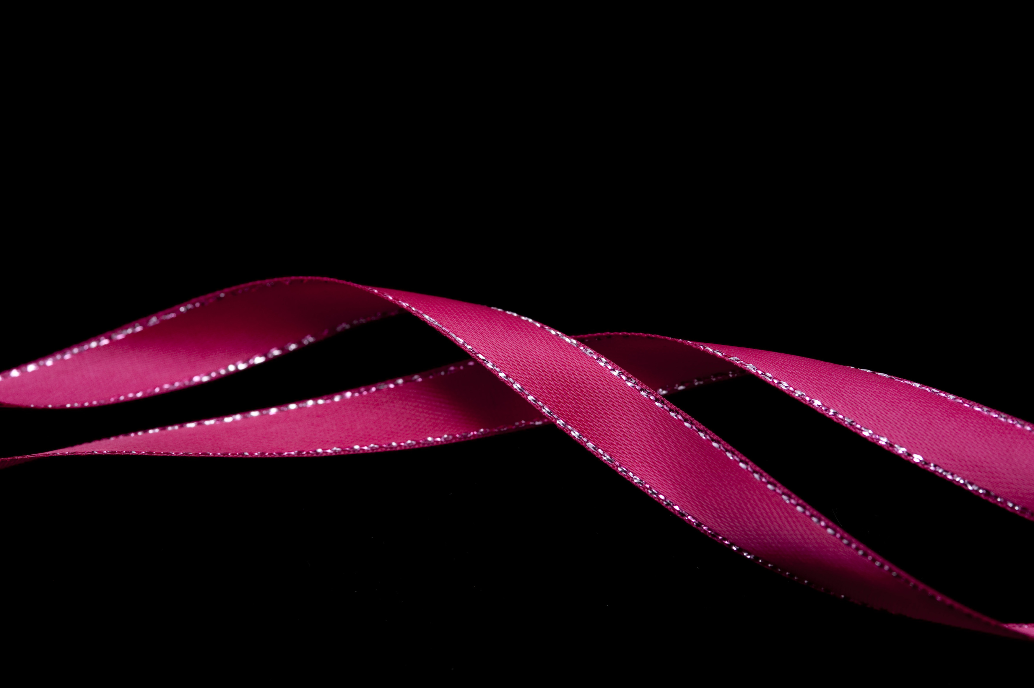 Keywords: background, black, copy space, pink, ribbon, twisted, sparkling, close up, textile, decorative, celebration, simplicity, fuschia, curled, detail