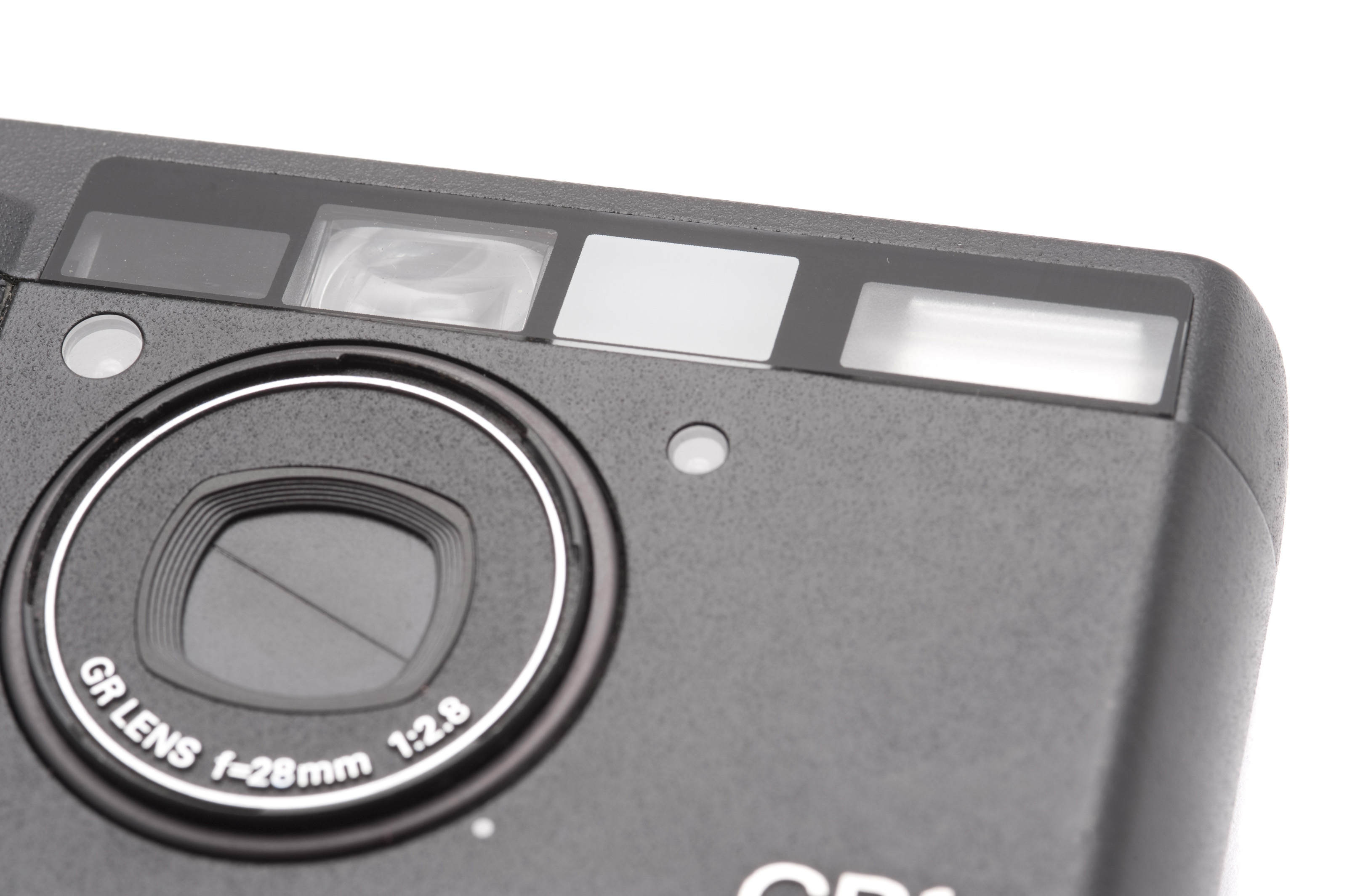 Close Up Still Life of Front of Point and Shoot Camera with Closed Zoom Lens, Built-In Flash and Viewfinder on White Background