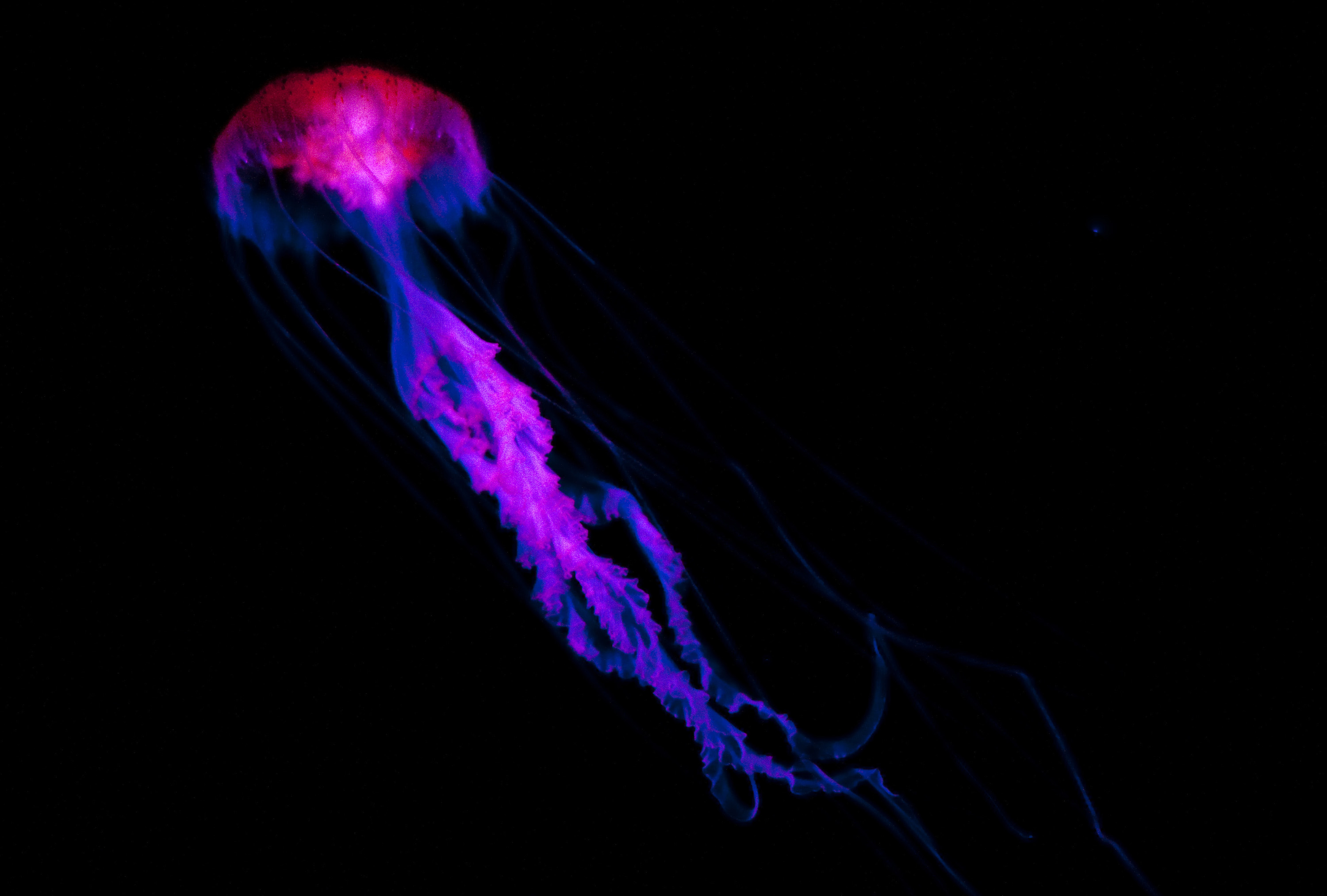 Keywords: underwater, aquatic, jellyfish, jelly fish, medusozoa, swimming, aquarium, sea jelly, bell, tentacles, stinging, marine, poisonous, tourist attraction, medusa, saltwater, marine biology, purple, illuminated, flourescence