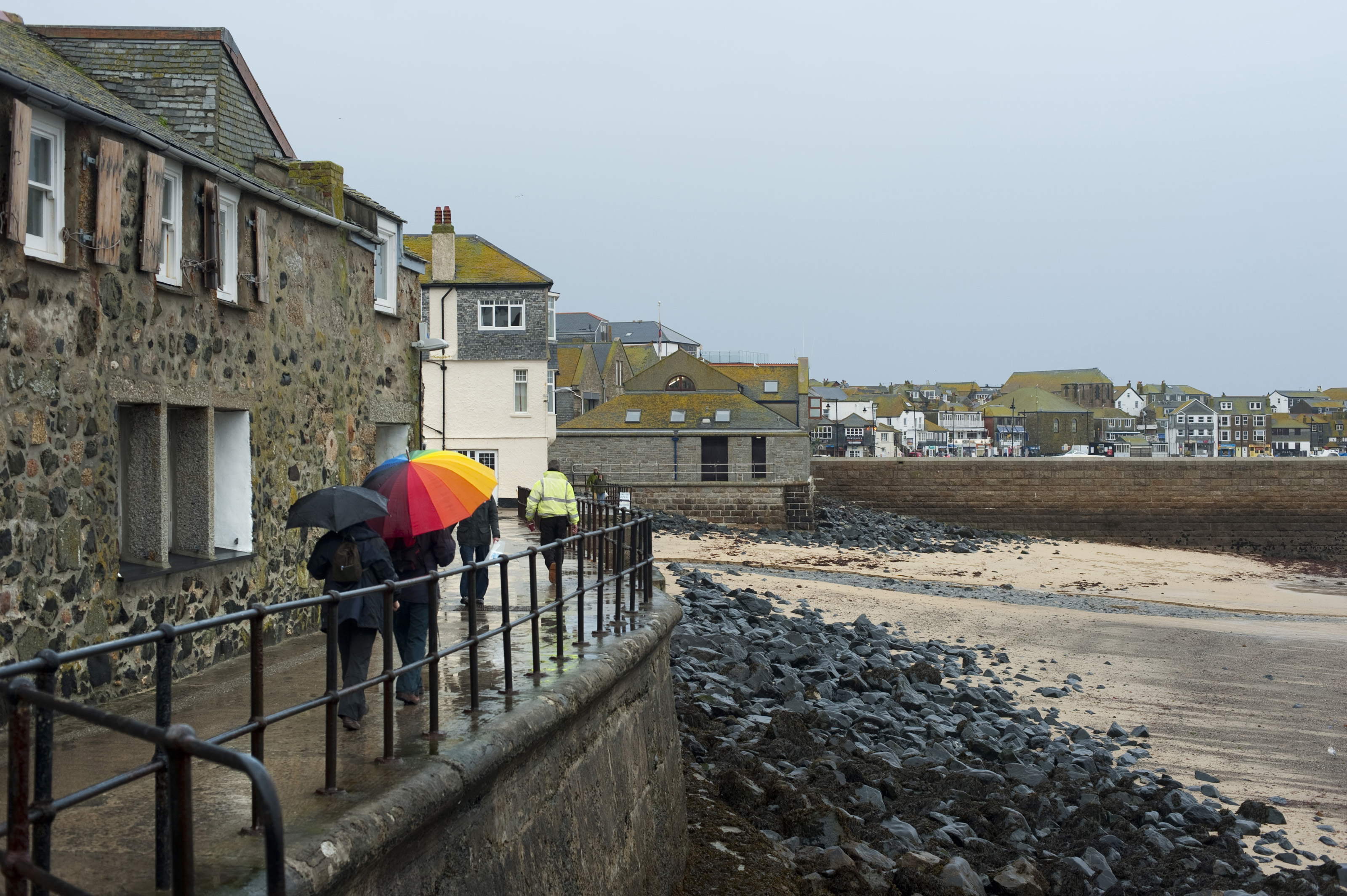 Keywords: people, travel, walking, beach, waterfront, coastal, walkway, weather, town, climate, fishing, rain, buildings, harbour, umbrellas, cornish, cornwall, holiday resort, st ives, saint ives