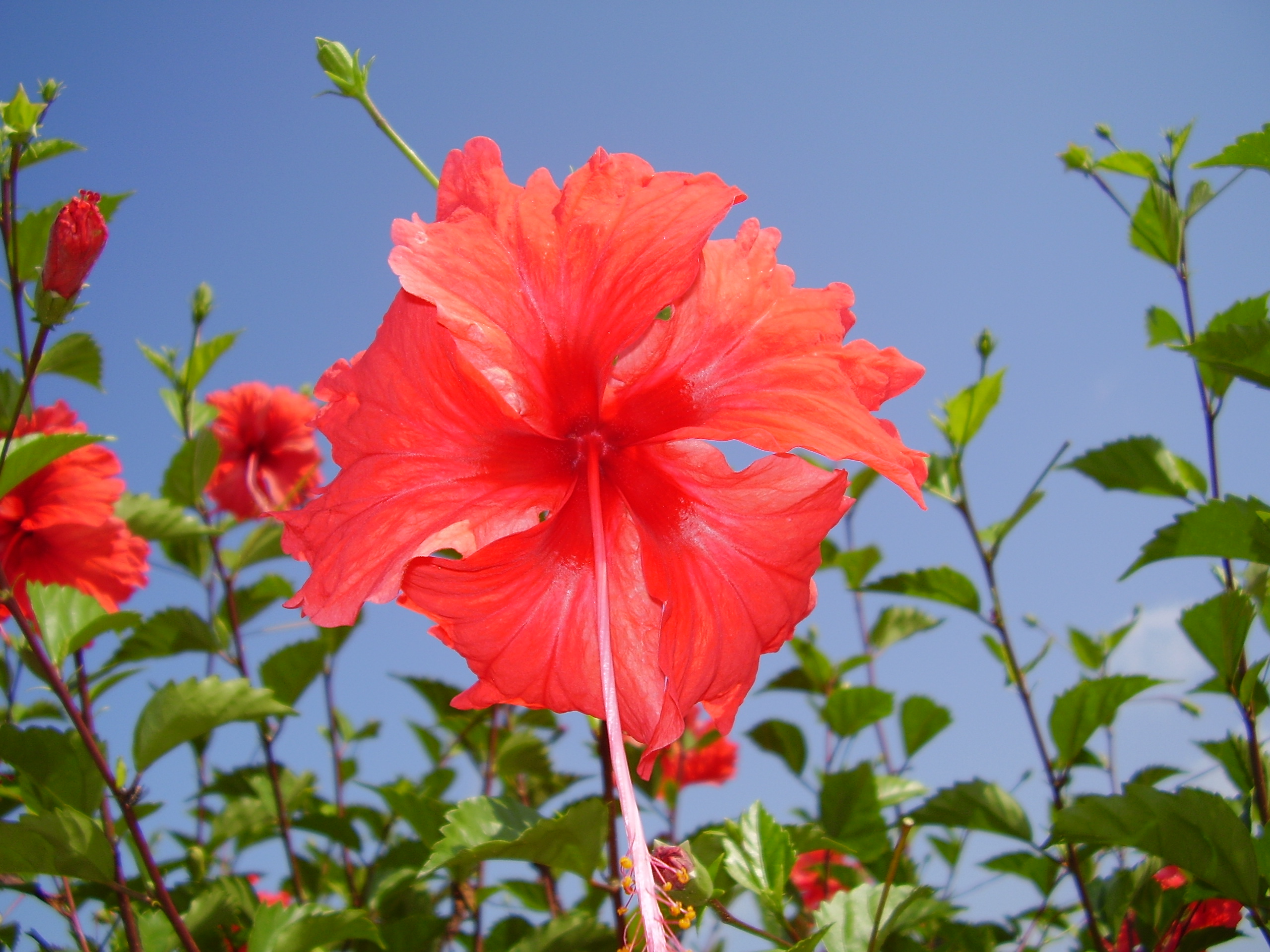 Keywords: bush, green, red, hibiscus, flower, flora, nature, tropics, tropical, blue, sky, fresh, nature