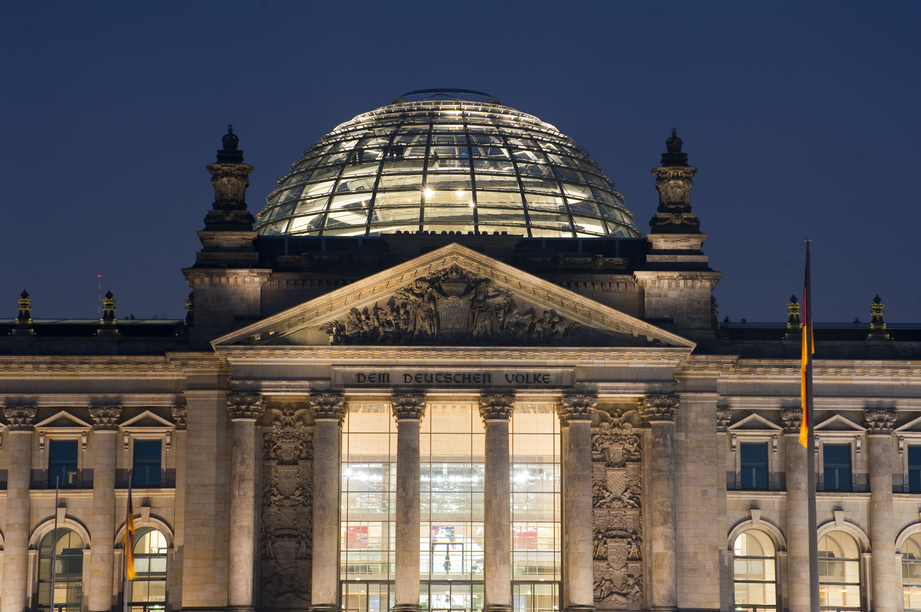The Reichstag building, Berlin, the seat of the German parliament, illuminated at night with the glass dome that replaced the original cupola and the dedication to the people on the architrave