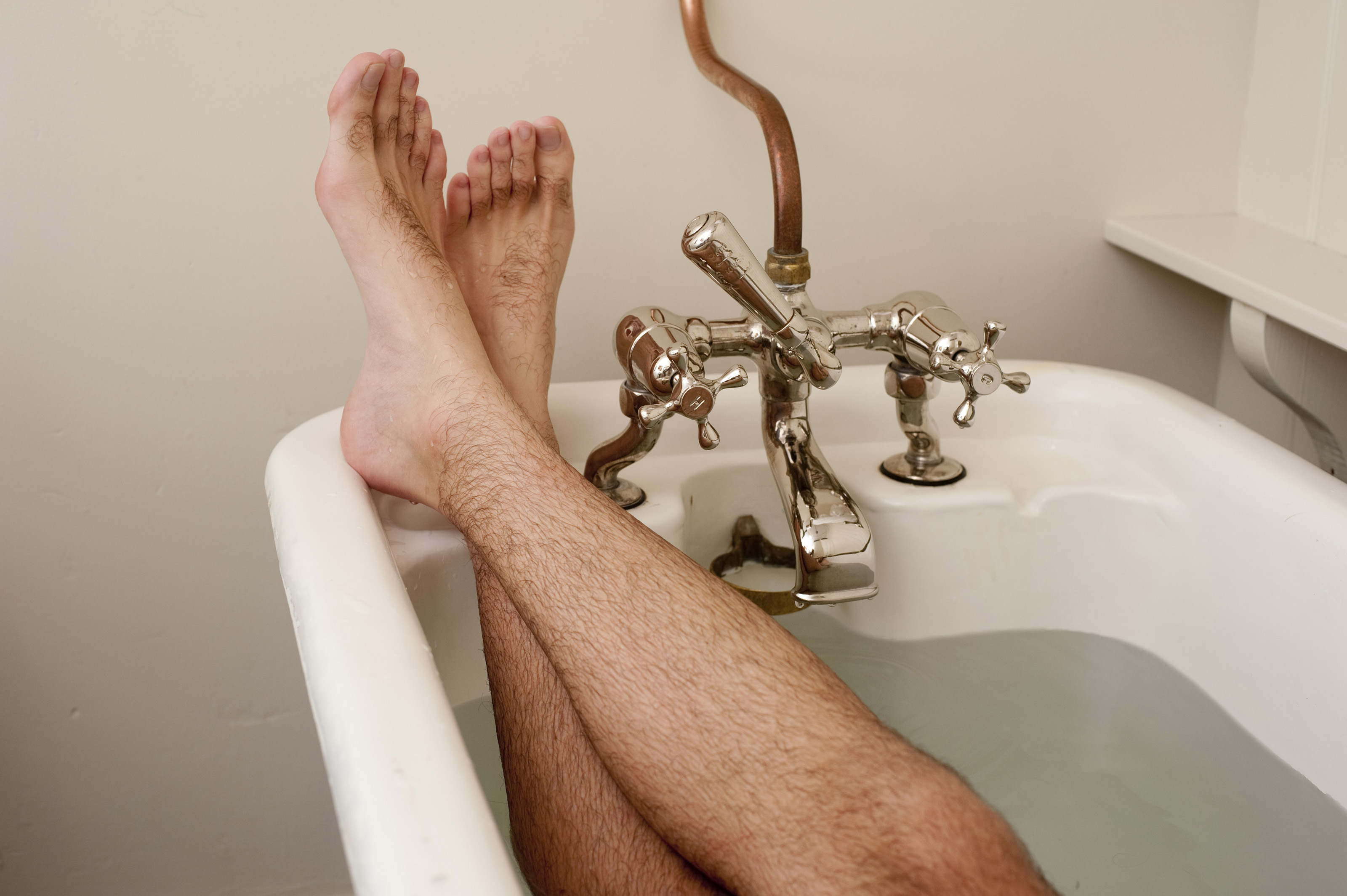 Keywords: bathroom, water, bath, bathtub, faucet, tub, old -fashioned, male, relax, relaxation, crossed, hairy, legs, feet, soaking