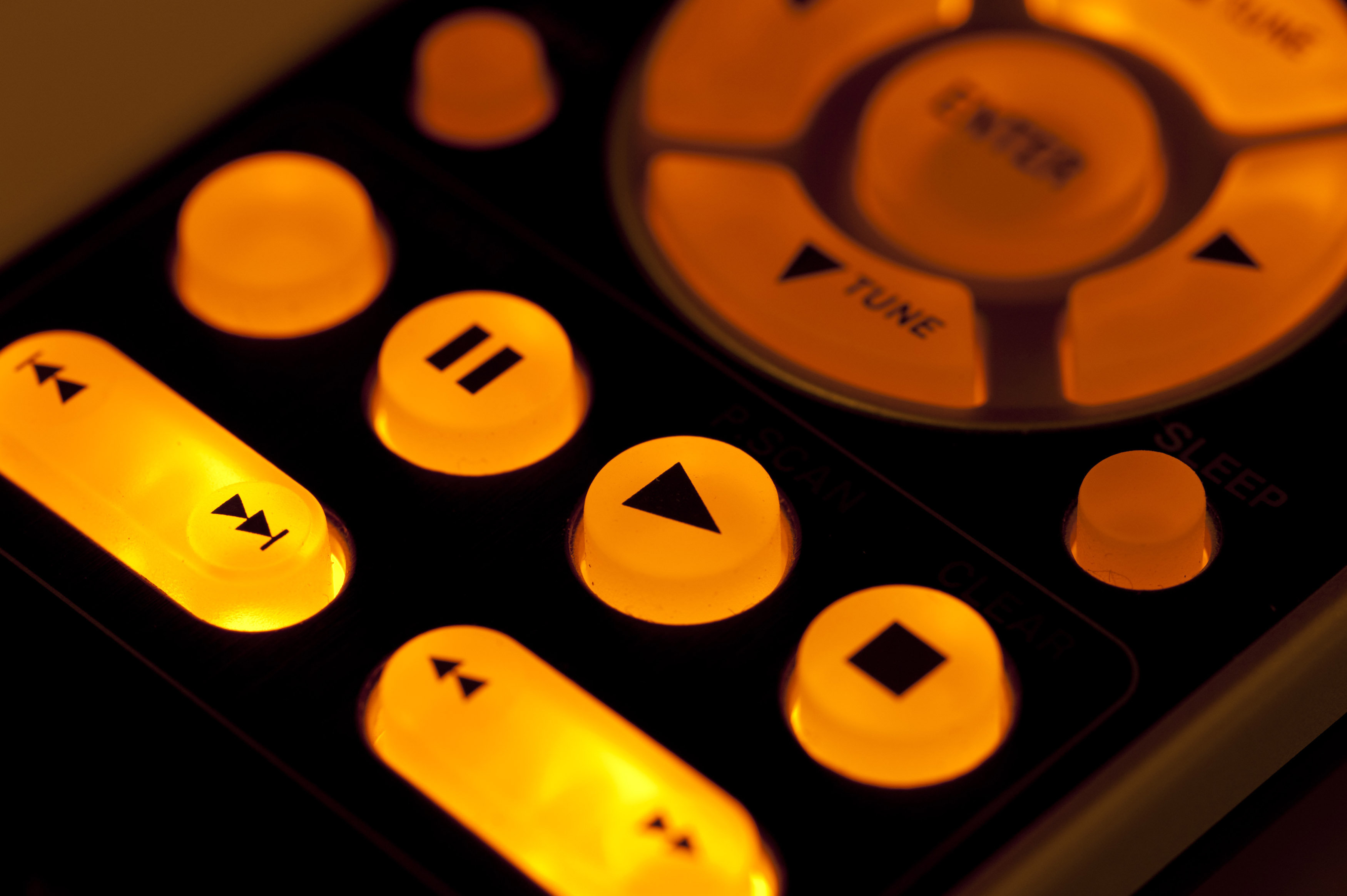 Remote control playback buttons illuminated from inside with warm yellow light in the dark, close-up cropped image