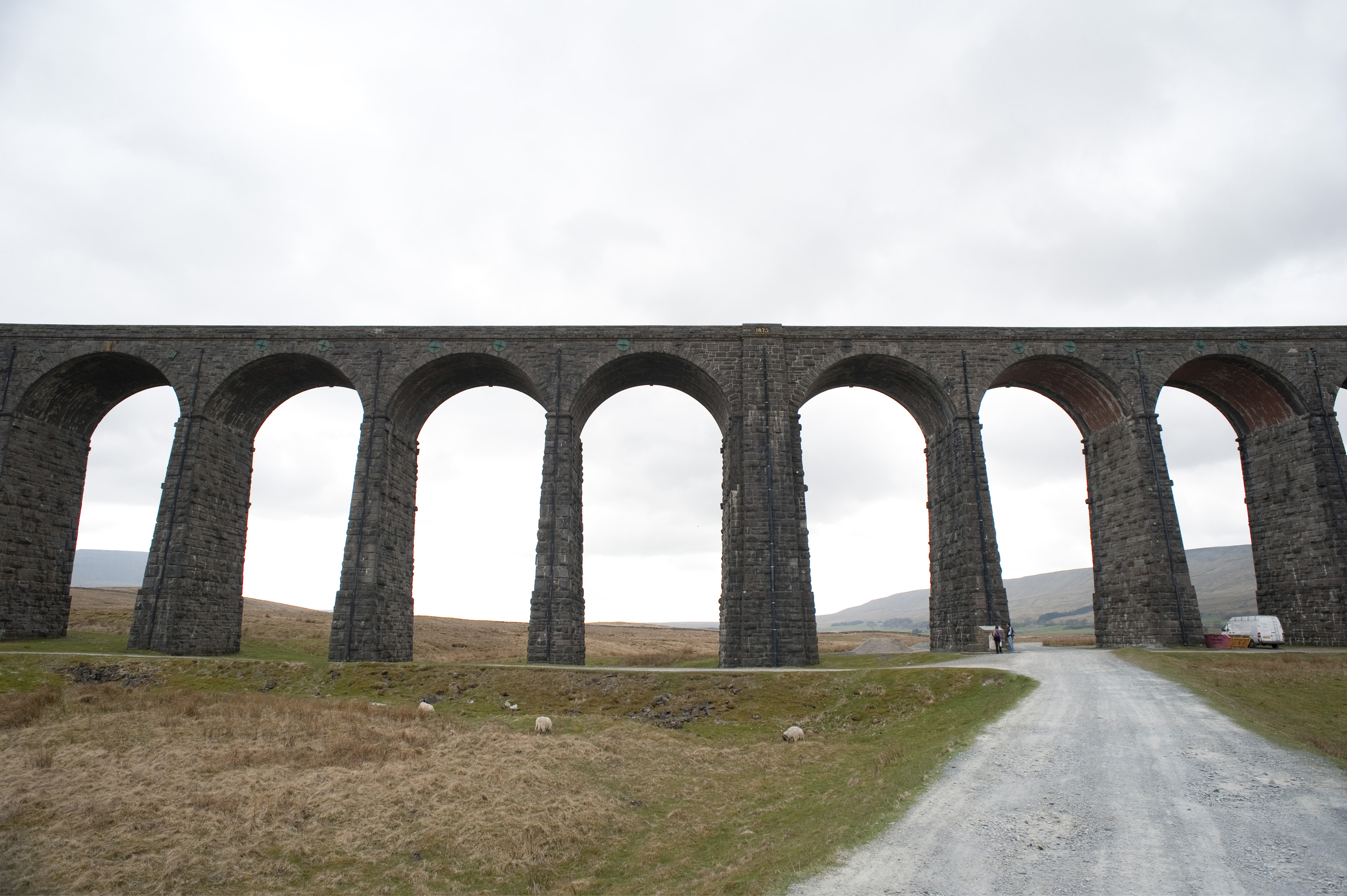 Keywords: travel, transport, stone, road, victorian, view, railway, historical, landmark, england, bridge, crossing, railroad, viaduct, arches, low angle, north yorkshire, ribblehead viaduct, river ribble, infrastructutre