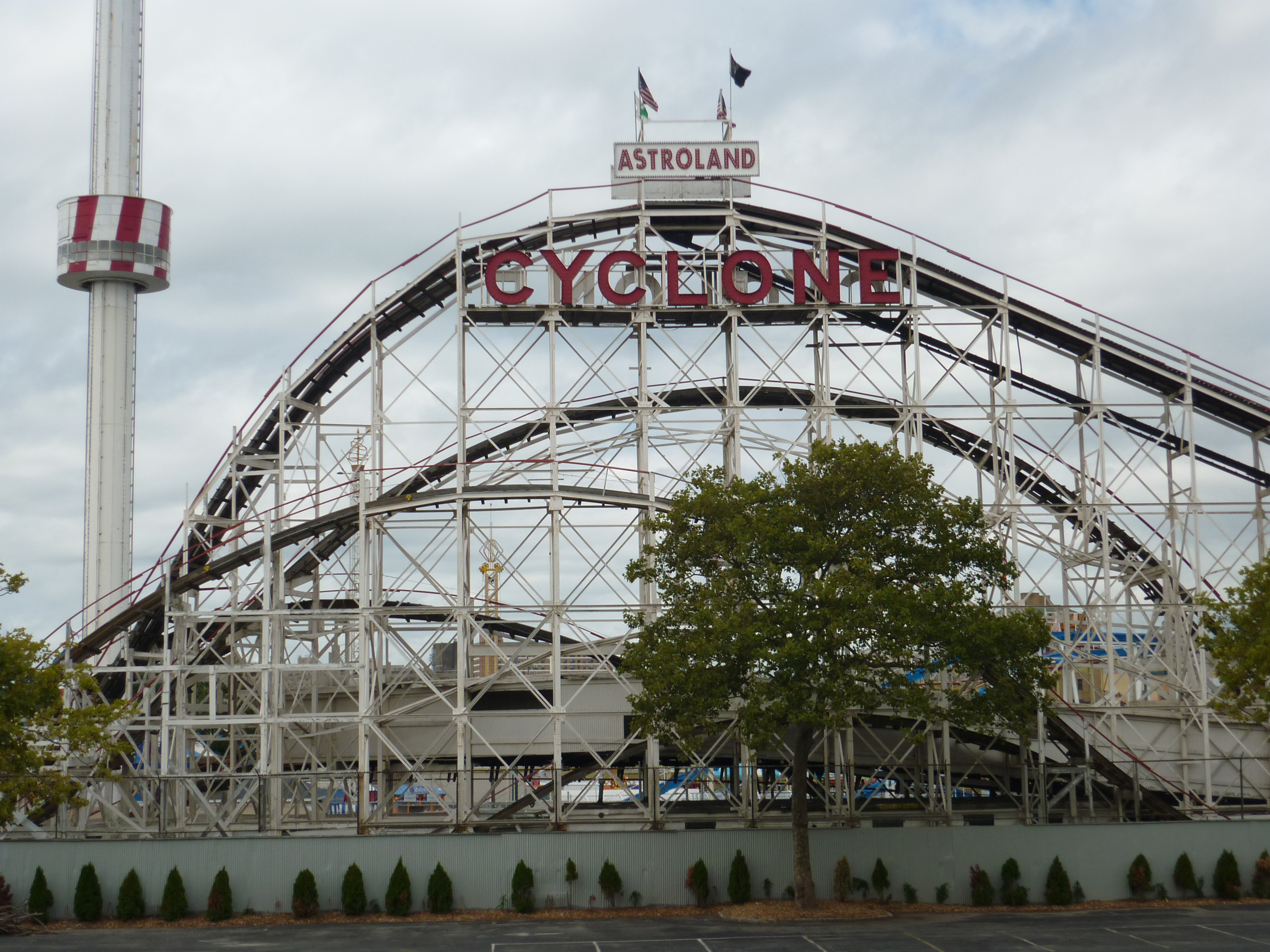 Steel framework of the Cyclone rollercoaster ride at Astroland amusement park silhouetted against a cloudy blue sky