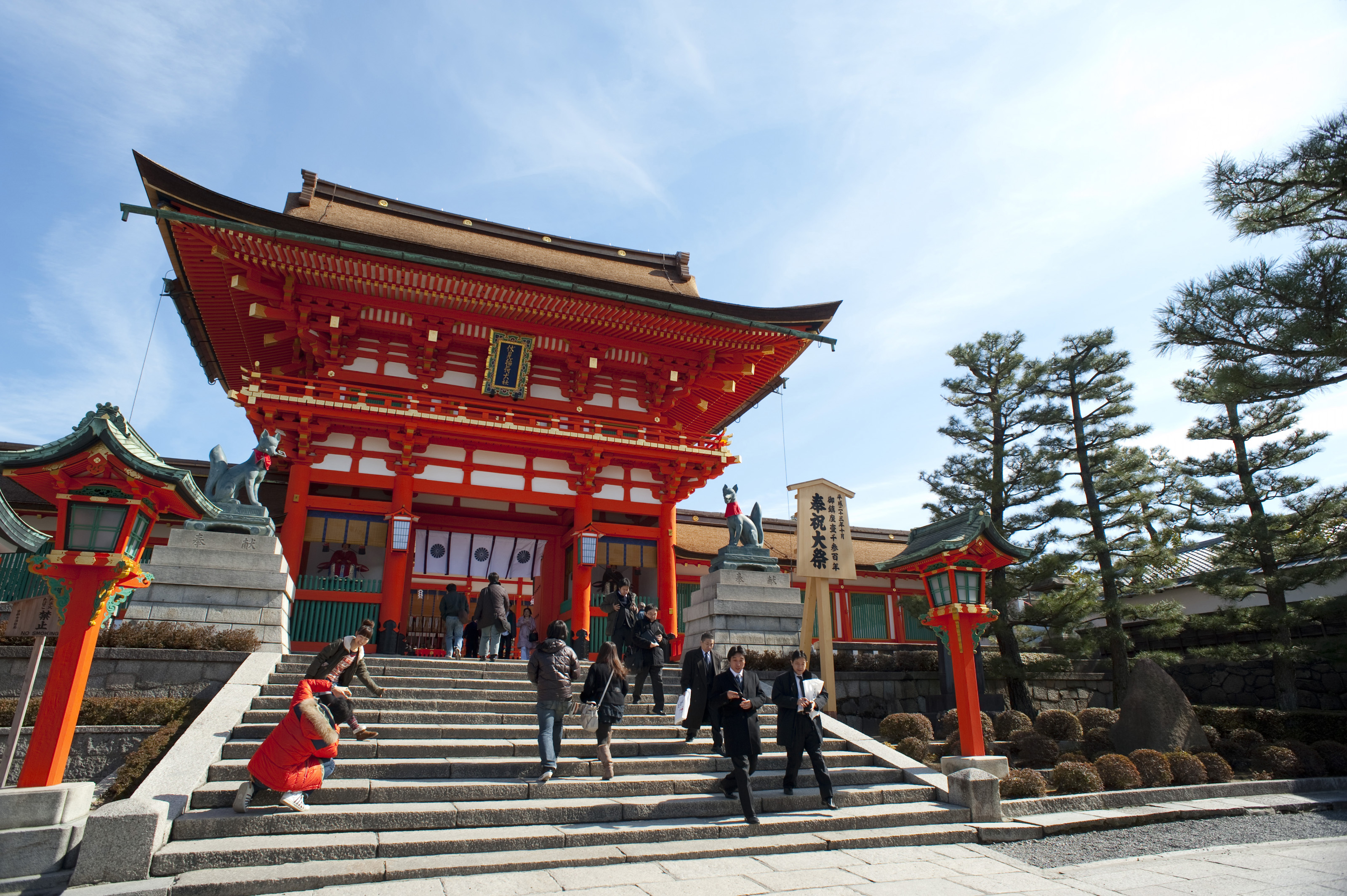 Keywords: architecture, building, construction, entrance, gate, inari shrine, japan, kyoto, pedestrians, people, red, romon, steps, structure, tower