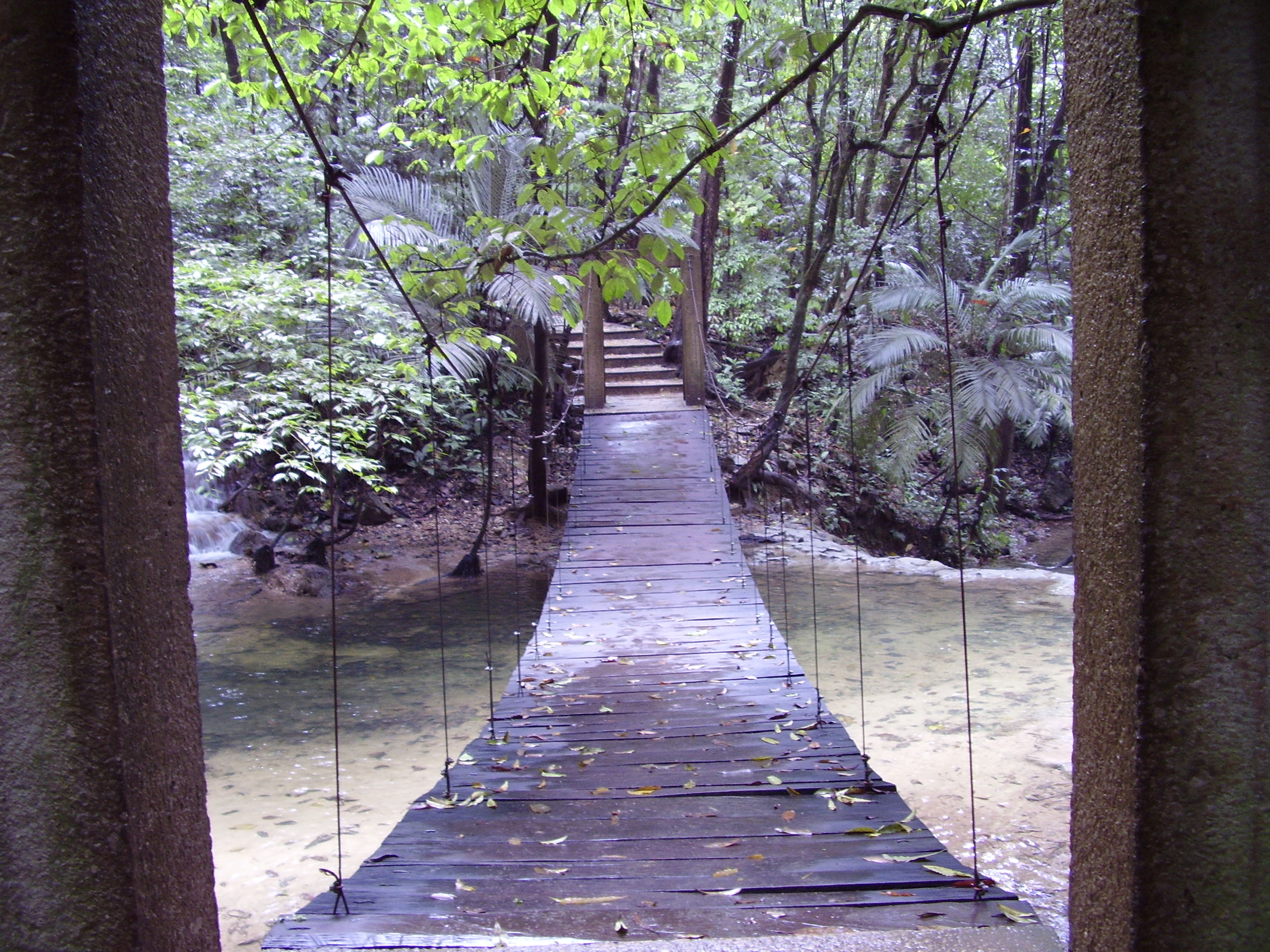 Keywords: creek, stream, bridge, crossing, water, ropebridge, rope bridge, planks, jungle, tropical, mexico