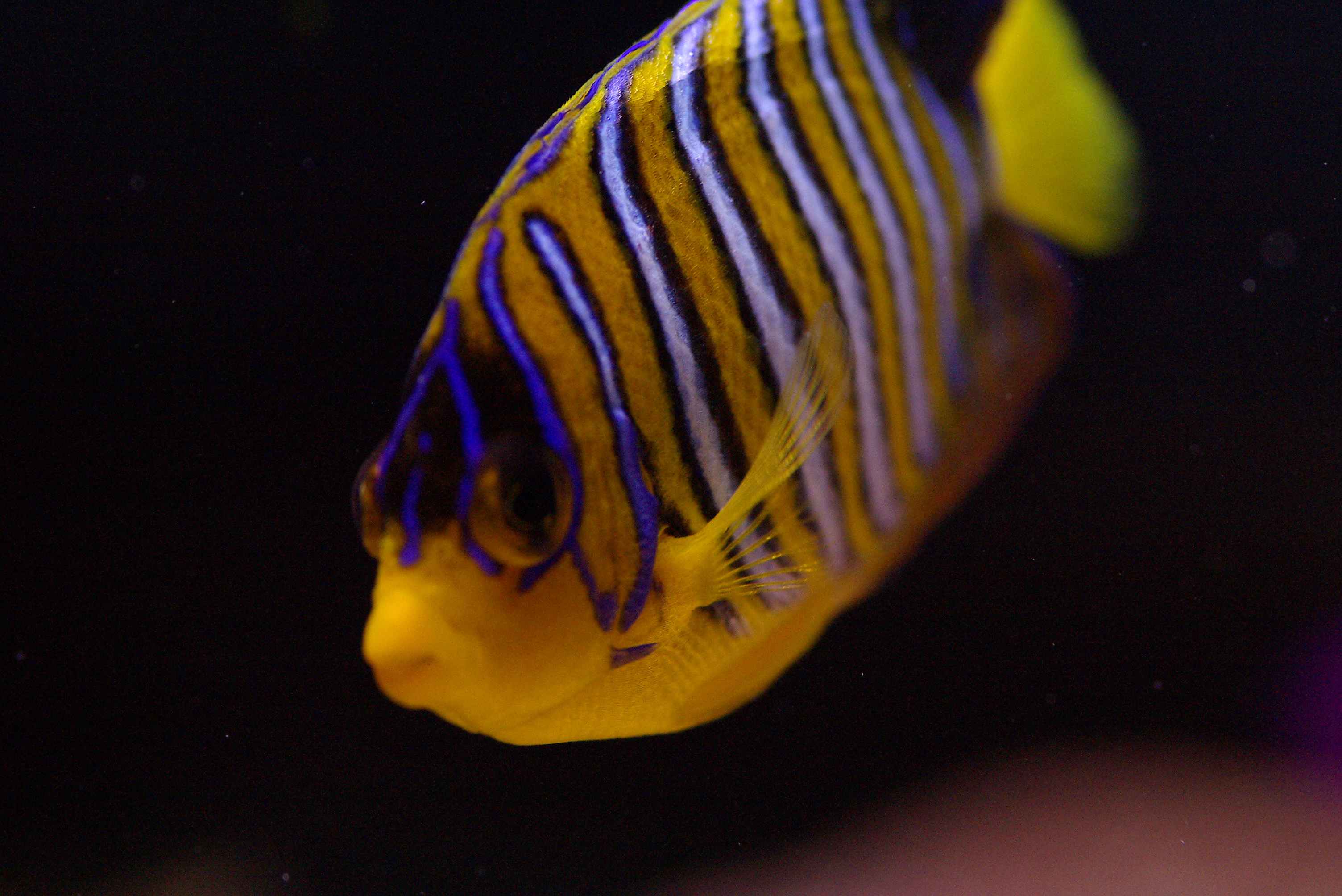 distinctive yellow and blue stripes of a yellow angel fish