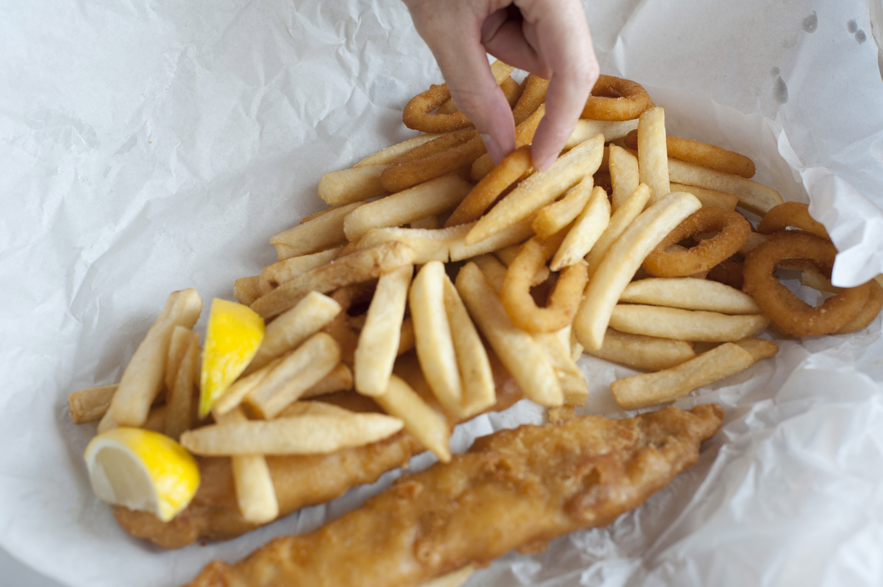 Keywords: chips, eating, fast food, fish, food, french fries, fried, hand, man, meal, oily, potatoes, seafood, unhealthy, vegetable, calamari, battered, lemon, yellow, greasy