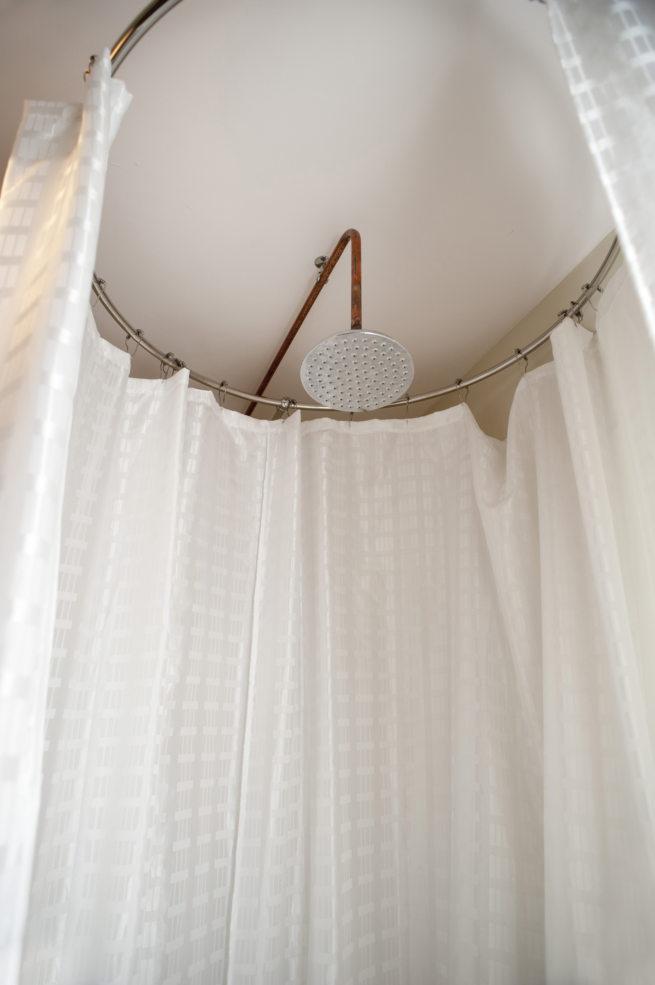 Low angle view looking up of a compact round shower cubicle with curtains on a circular rail and a metal shower head