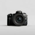 Front view of isolated single lens reflex digital camera with adjustable lens over white background