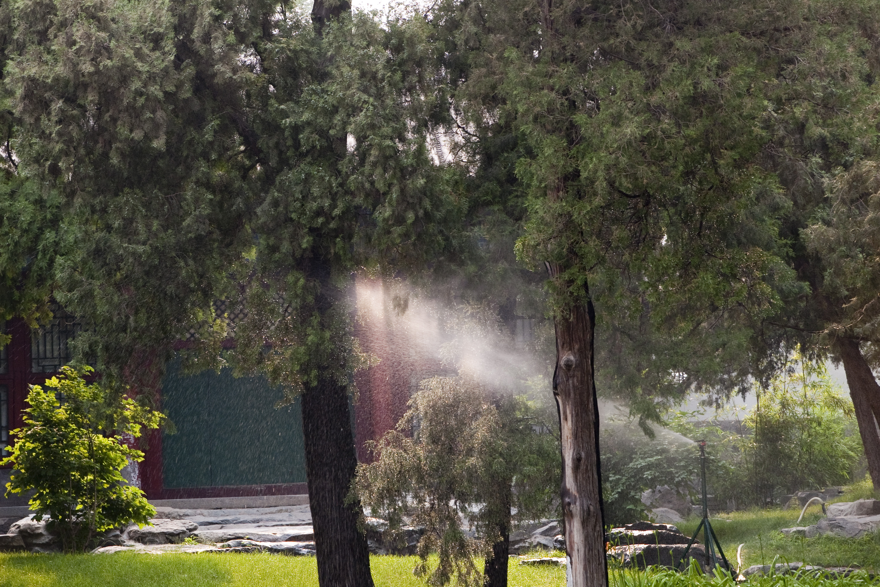 a sprinkler watering plants in a beijing park