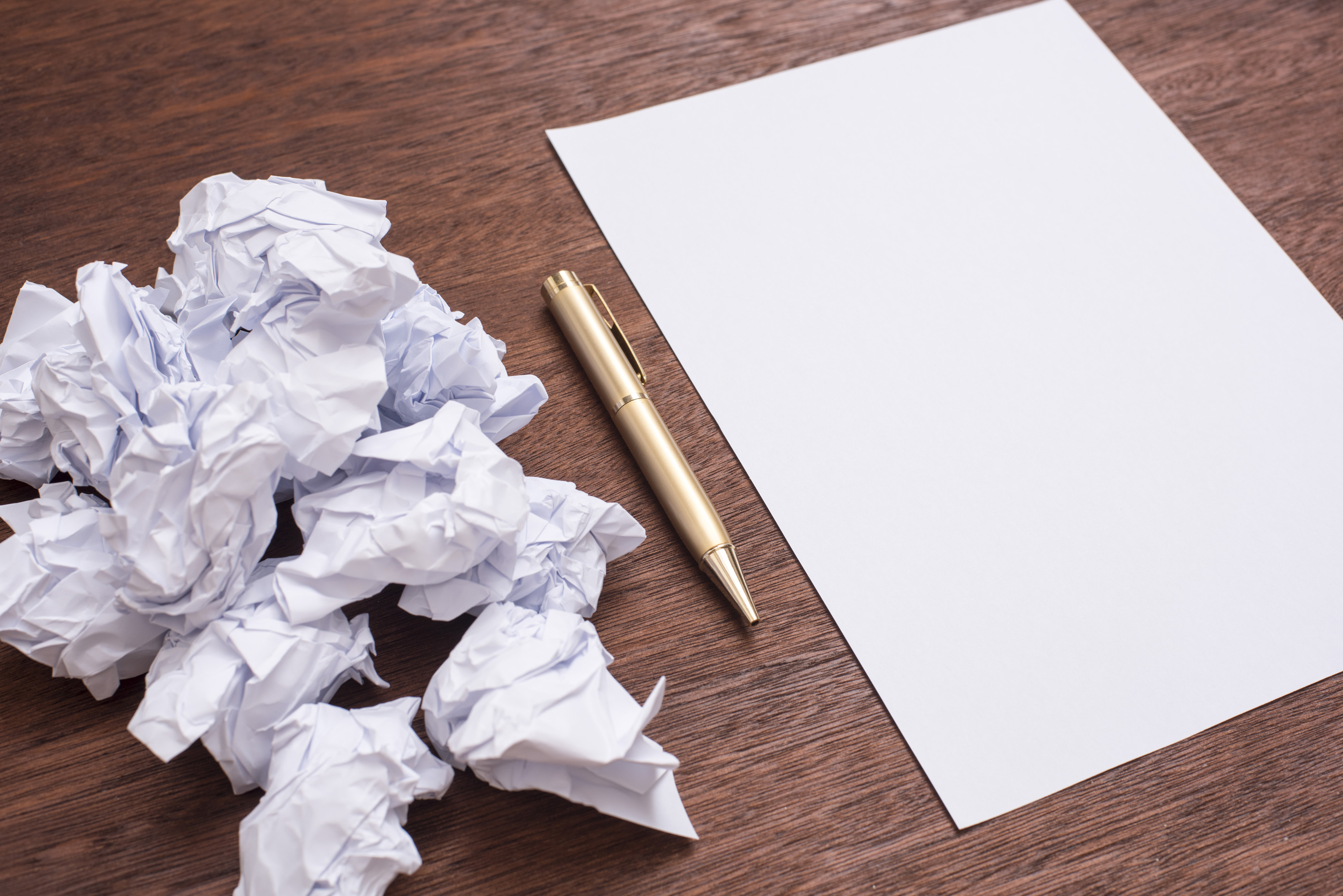 Starting a project and clean sheet of paper and a pen on wooden desk, next to a bunch of crumpled papers with bad ideas