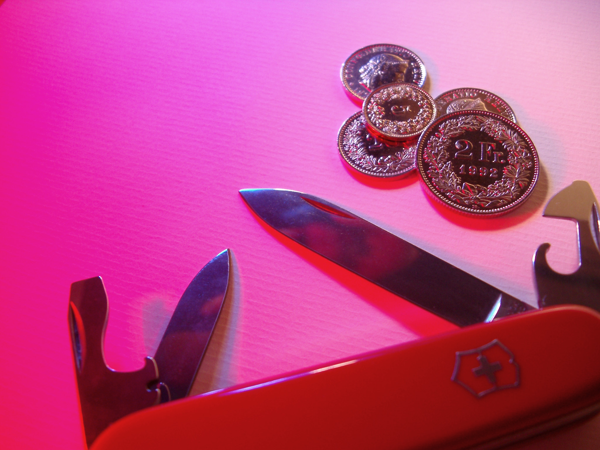 Keywords: knife, blades, sharp, cutting, tool, multitool, multiple uses, versatile, victorinox, red, colourful, currency, switzerland, swiss, coins, money, francs