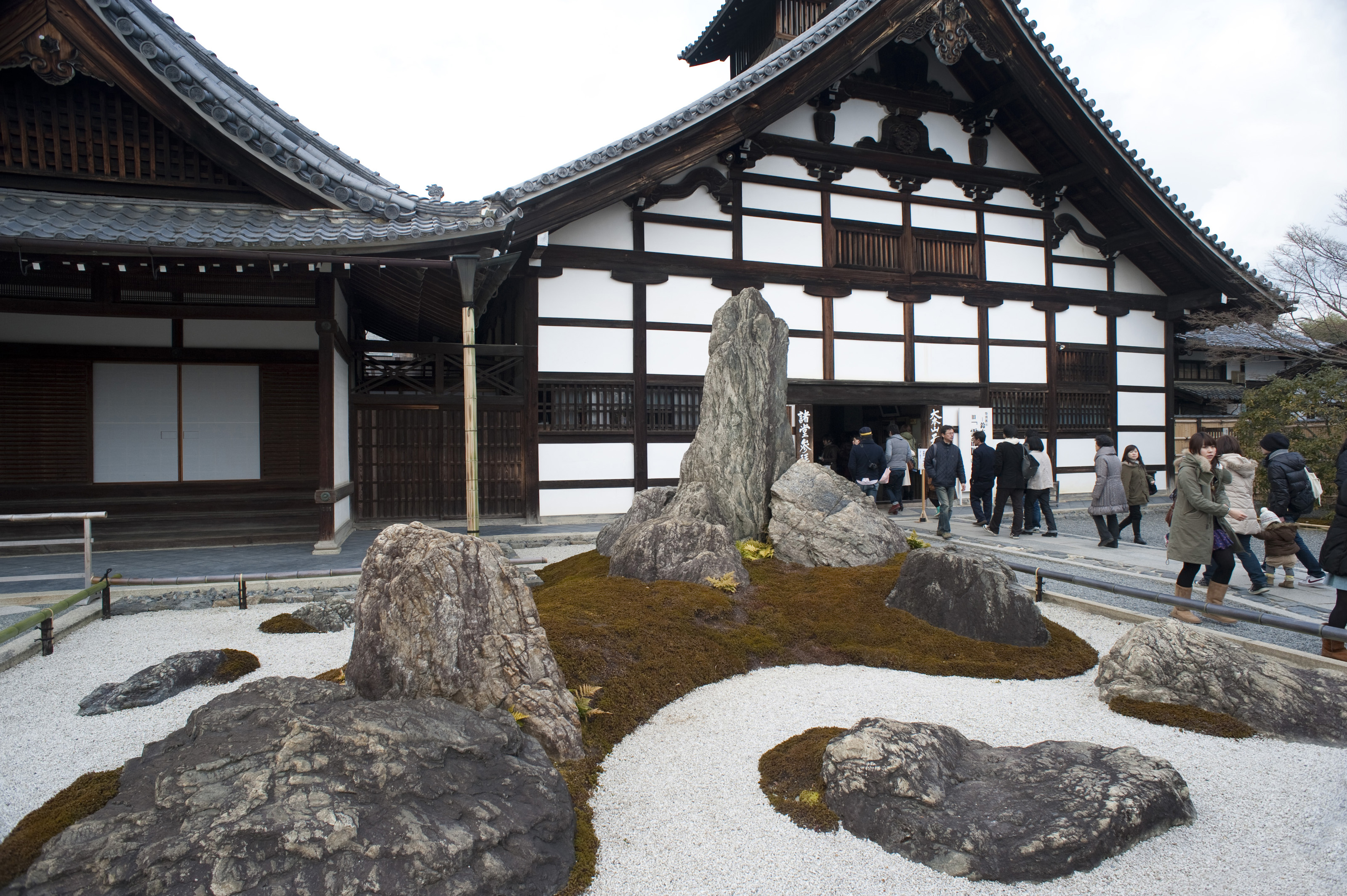 Keywords: people, building, landscape, pattern, entrance, architecture, pebble, dry, garden, walking, rocks, sand, exterior, zen, temple, traditional, arashiyama, raked, tenryu-ji, tenryu shiseizen-ji