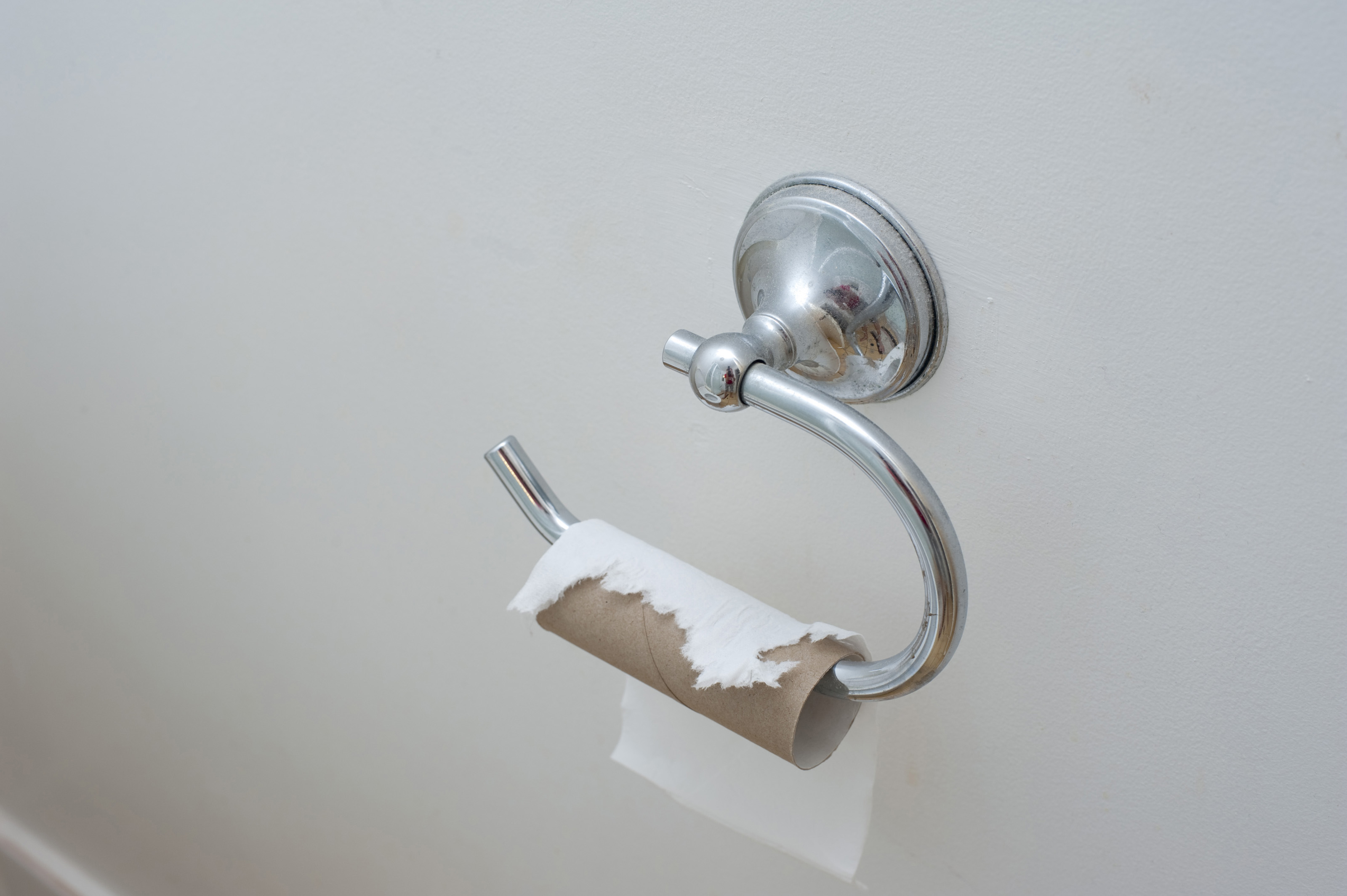 Toilet paper holder on white wall with an empty roll of paper