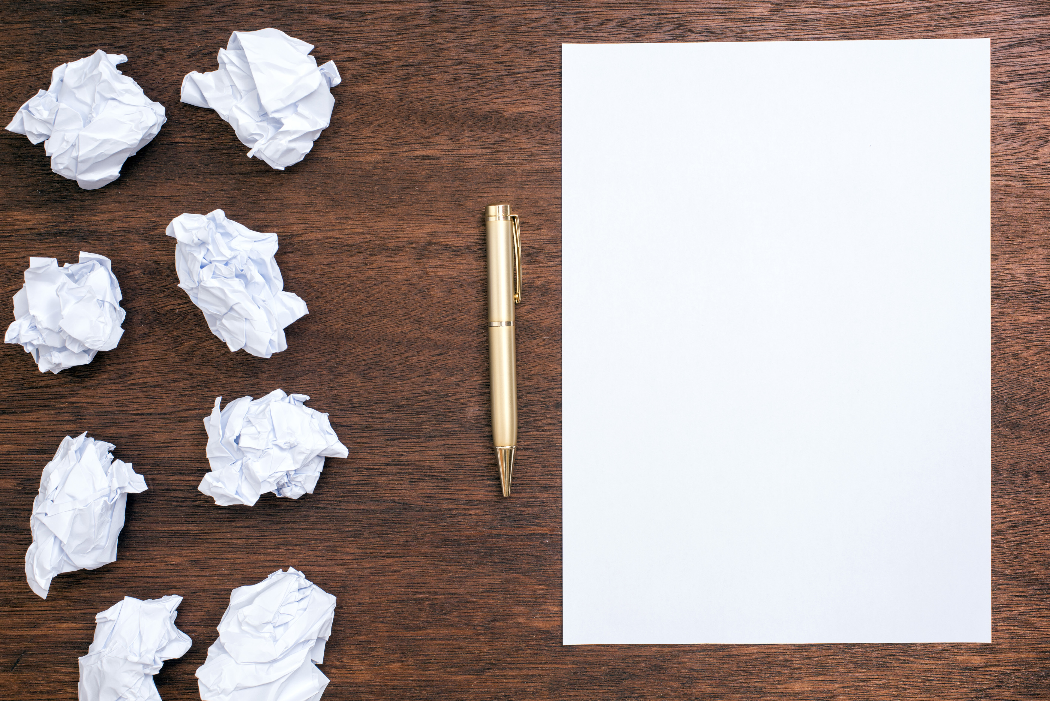 Trouble getting started concept with balls of crumpled paper alongside a blank white sheet with pen on a wooden desk signifying writers block or lack of ideas and inspiration
