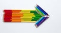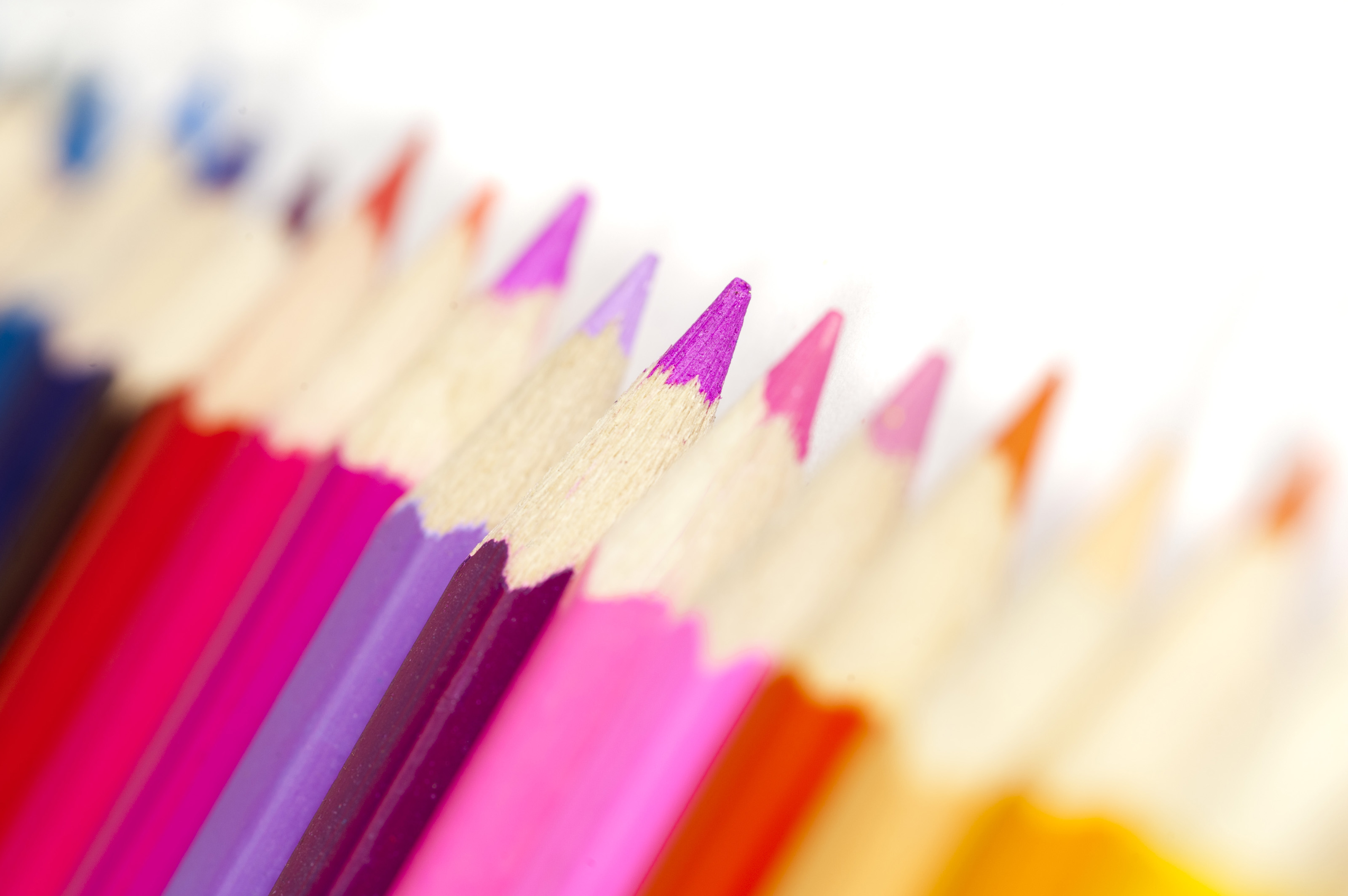 Extreme macro selective focus close up view on warm tones of colored pencils over white background