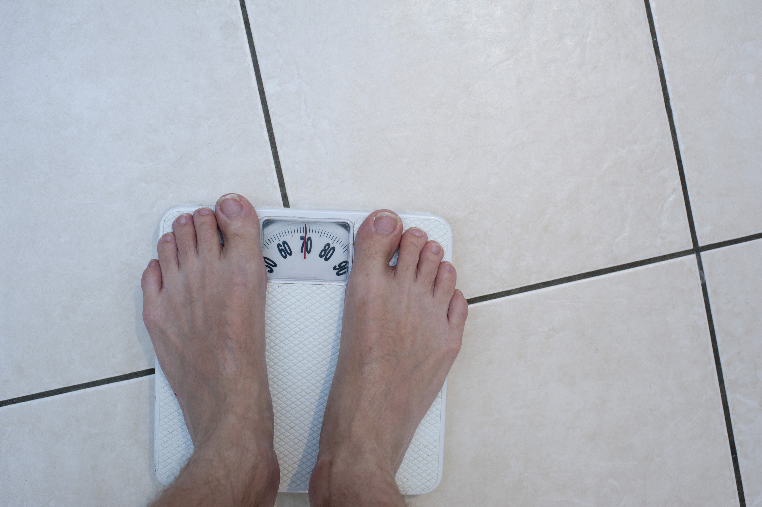 Keywords: bathroom, standing, man, scale, measurement, health, diet, feet, weight, weigh, copyspace, tiles, overhead, barefoot, display