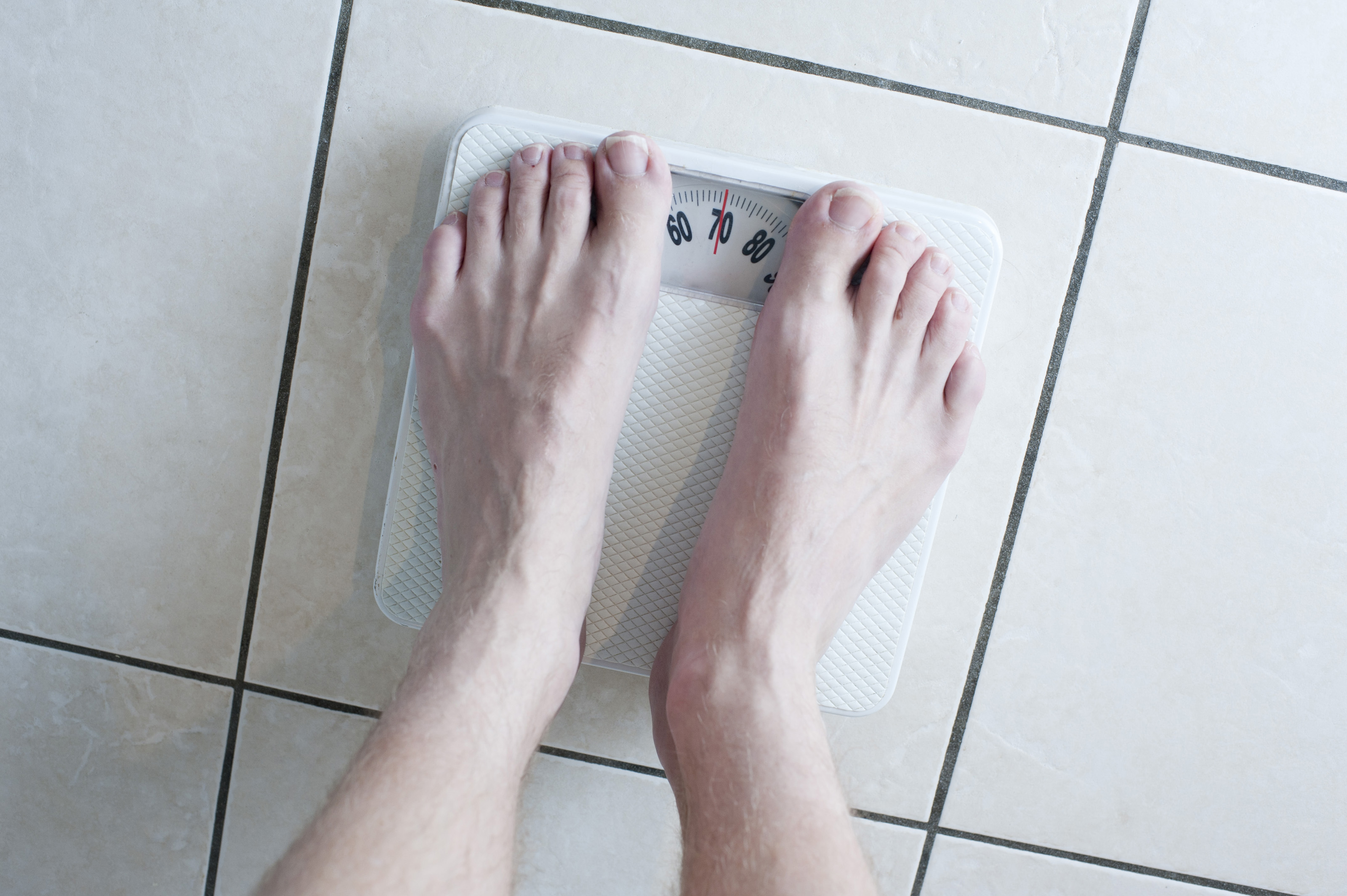 Overhead view of a barefoot man weighing himself on a bathroom scale to monitor his weight gain or loss