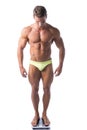 Keywords: standing, man, electronic, scale, body, measurement, health, loss, display, diet, bathroom, nutrition, feet, gain, weight, weigh, overhead, barefoot, weighing, kilograms