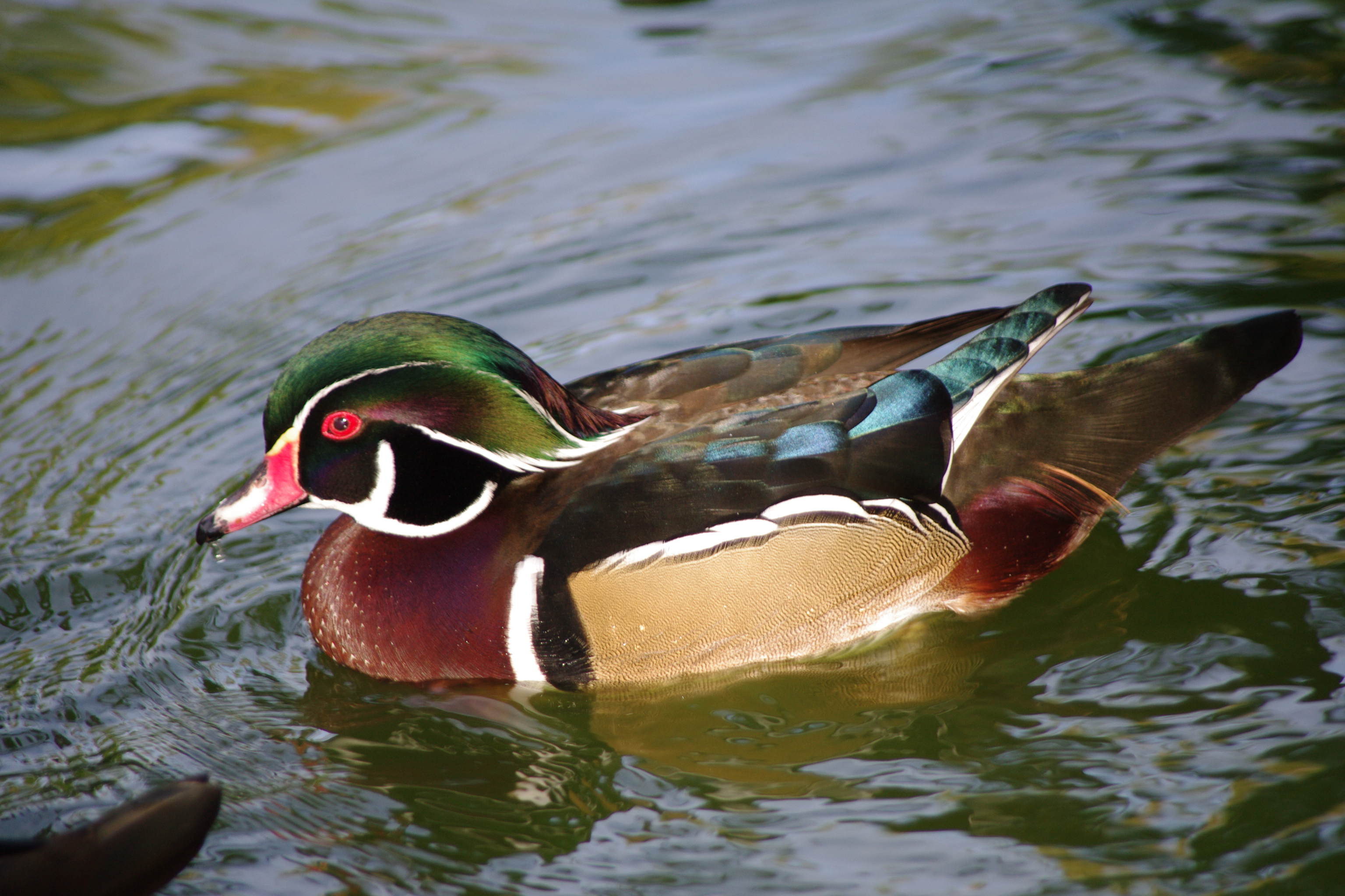 Keywords: duck, Aix sponsa, male, woodduck, wood duck, water, float, swim, plume