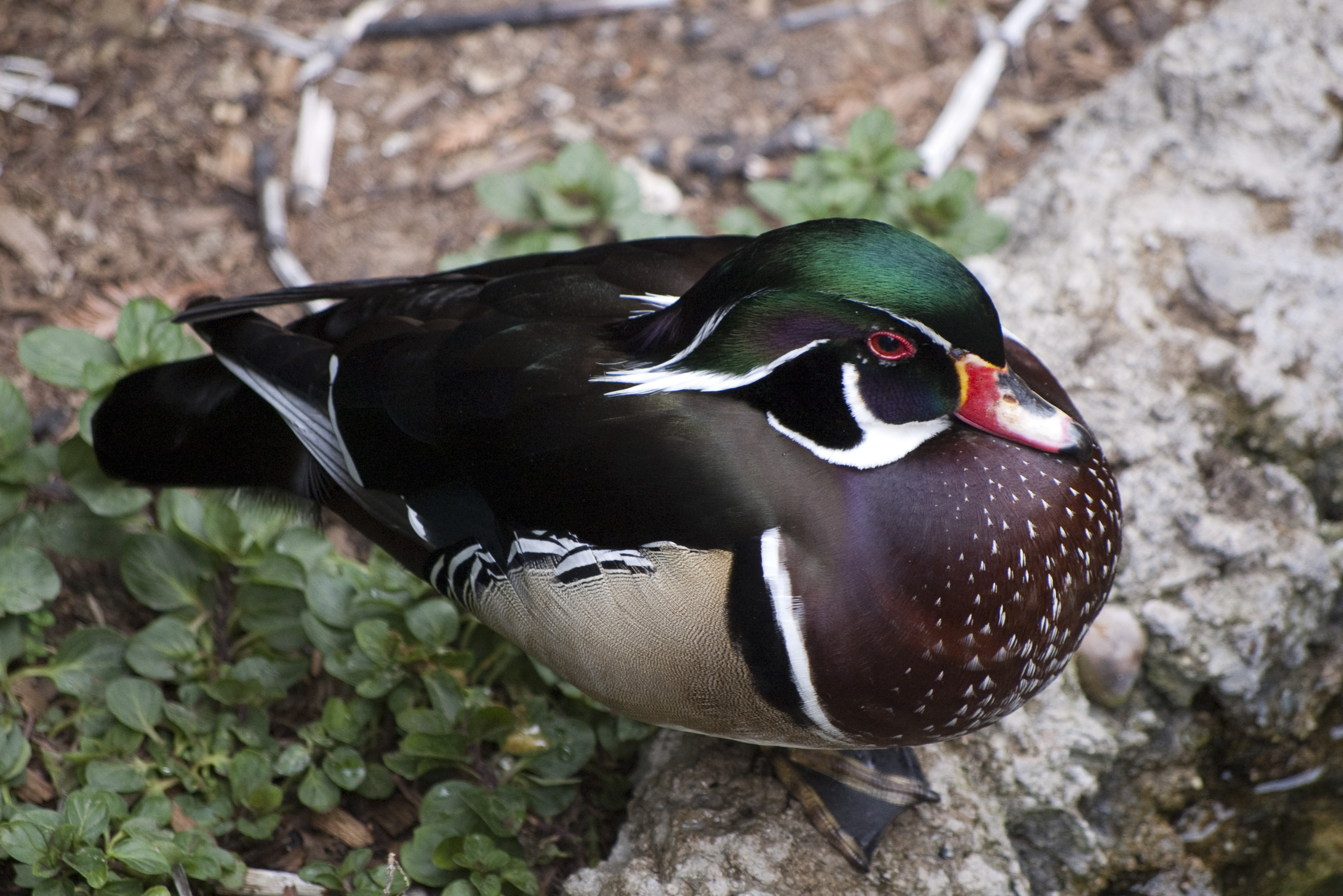 Keywords: wood duck, bird, animal, male, feathers, eye, huddled