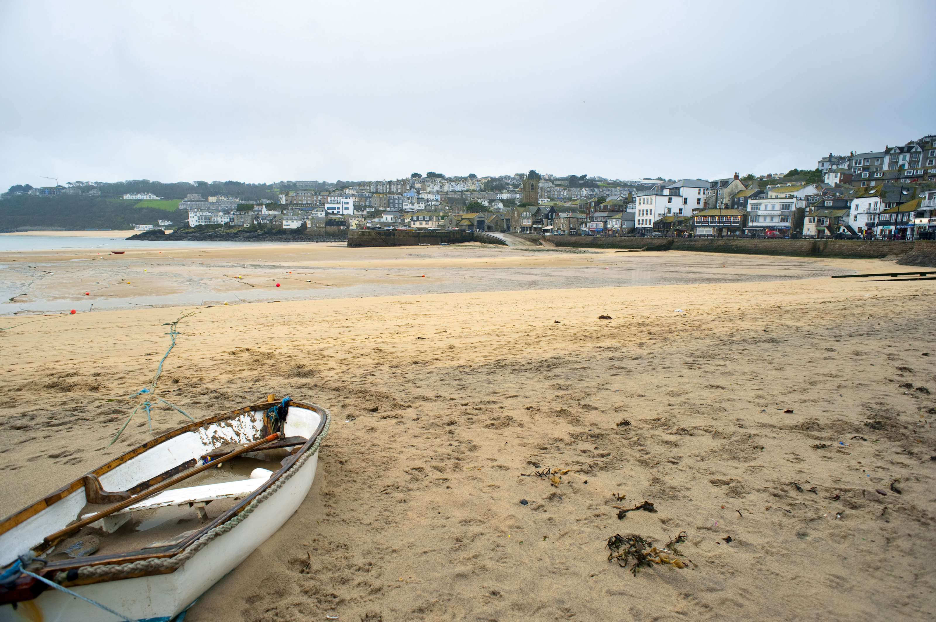 View across a sandy beach with a small wooden dinghy in the foreground of the popular fishing town of Saint Ives, Cornwall