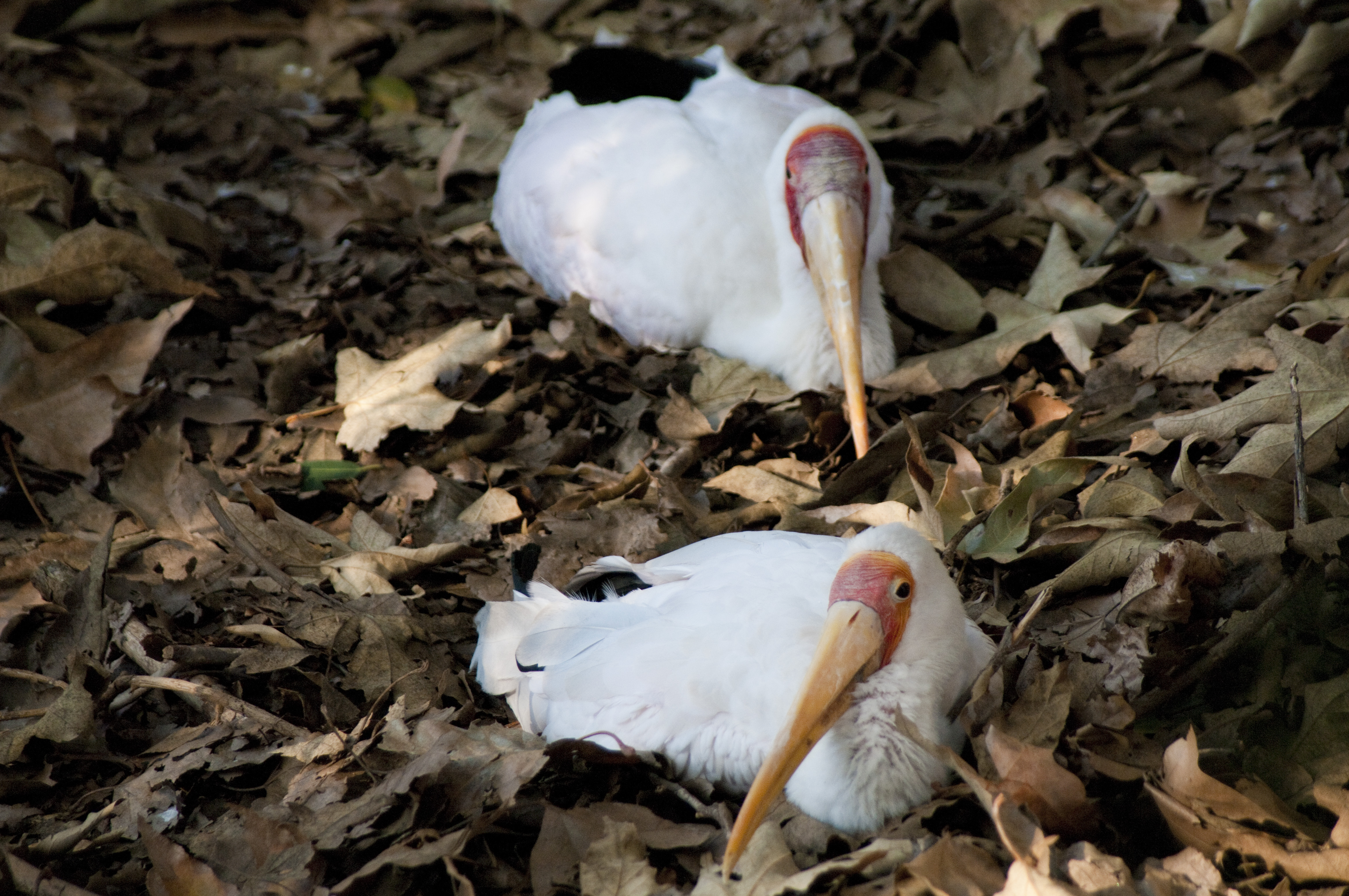 two young yellow billed storks sat on a bed of leaves