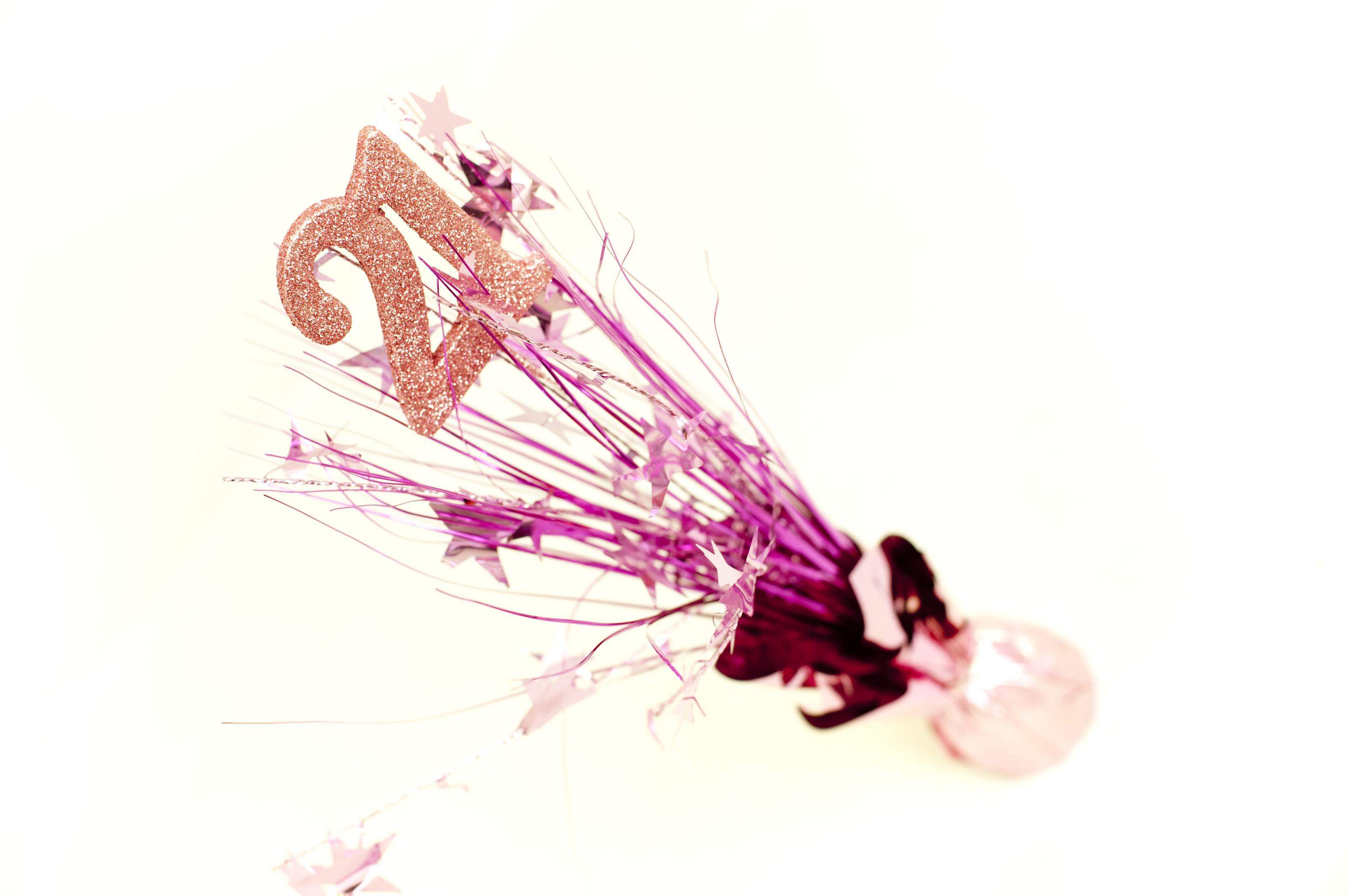 Angled Still Life of Pink Centrepiece for Young Woman 21st Birthday Celebration on White Background