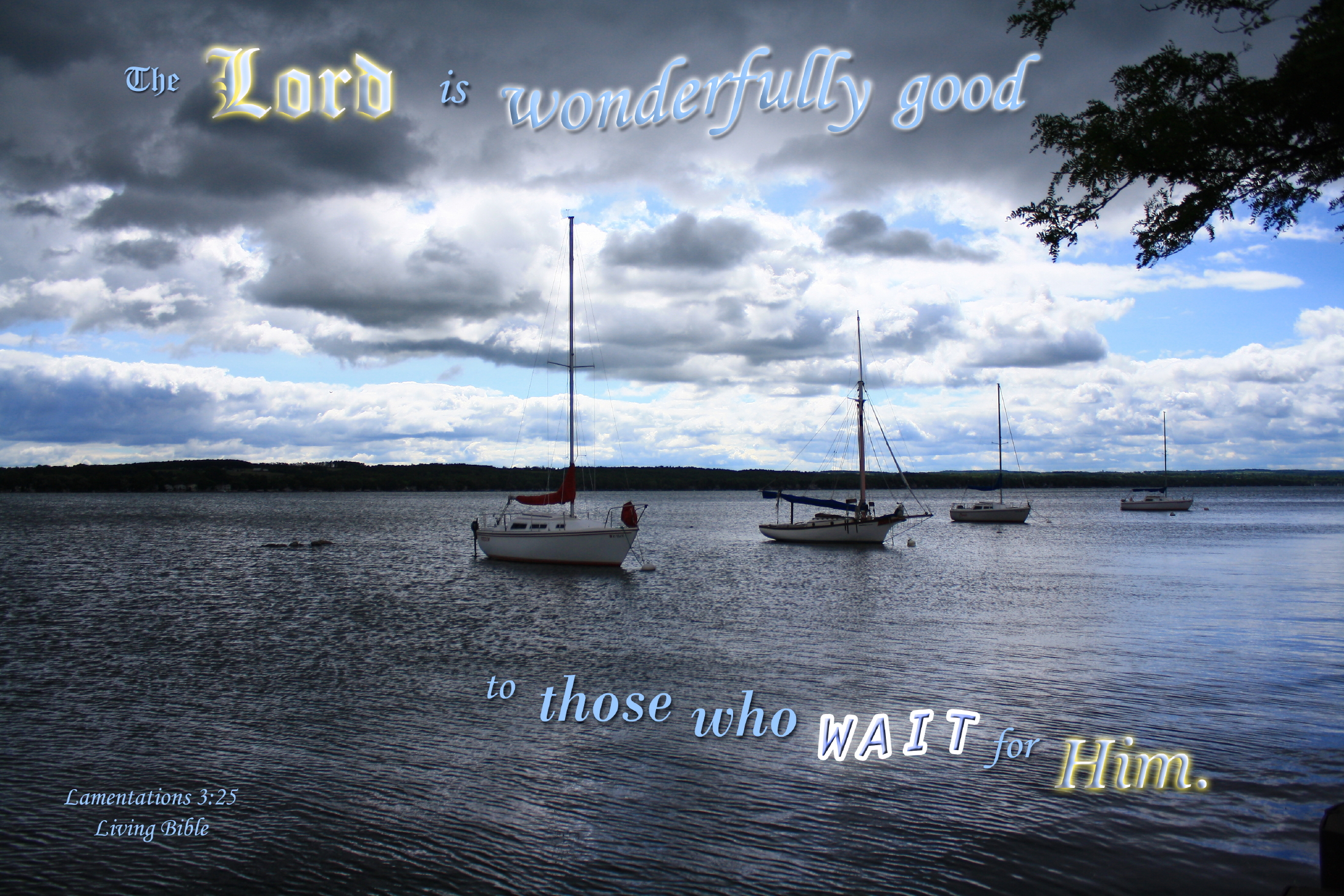 Sailboats anchored on lake with overcast, cloudy skyPhoto Title: The Lord is Good to Those Who Wait