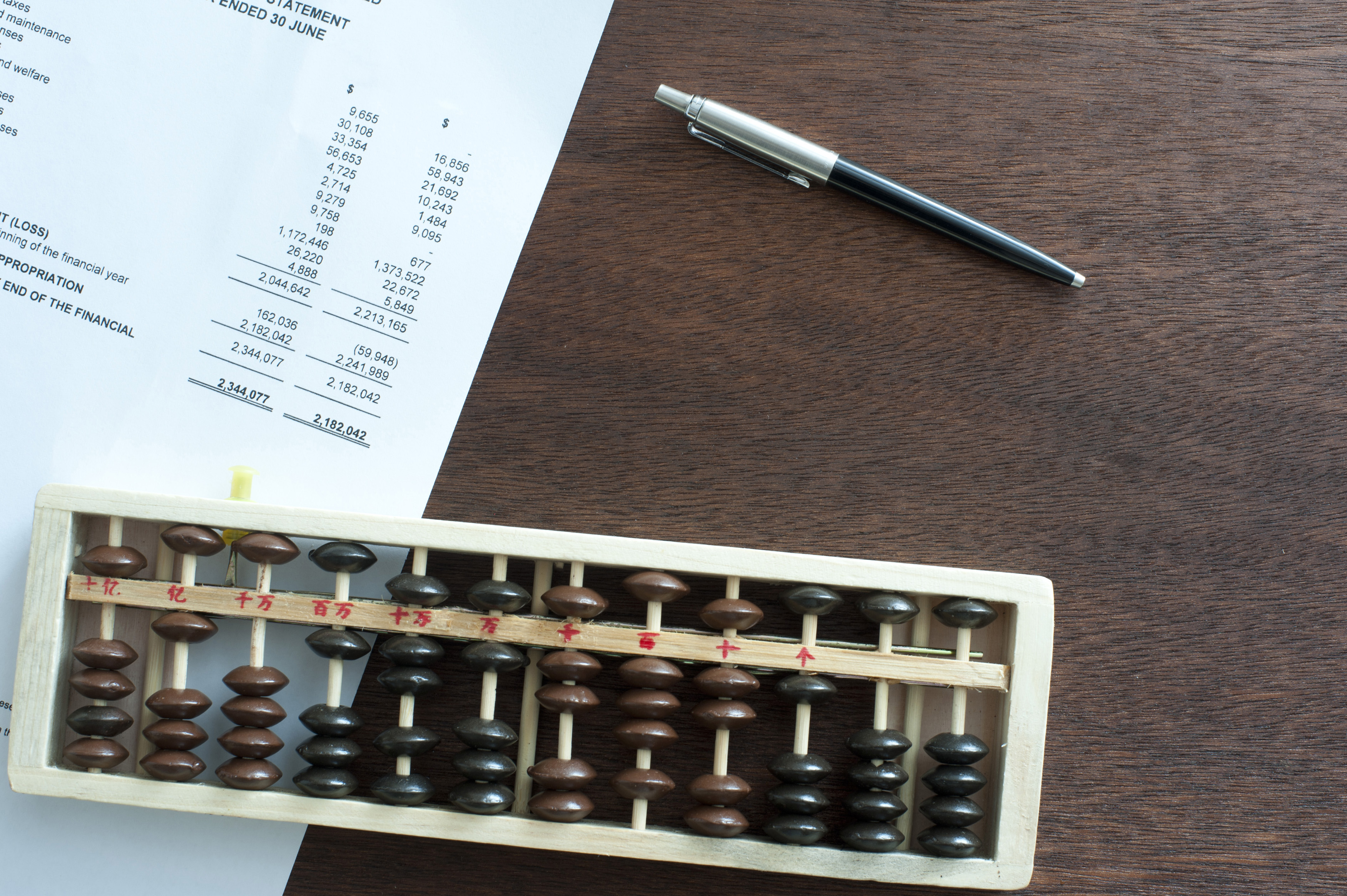 Short wooden rectangular abacus on table beside two toned executive pen and a printed income statement
