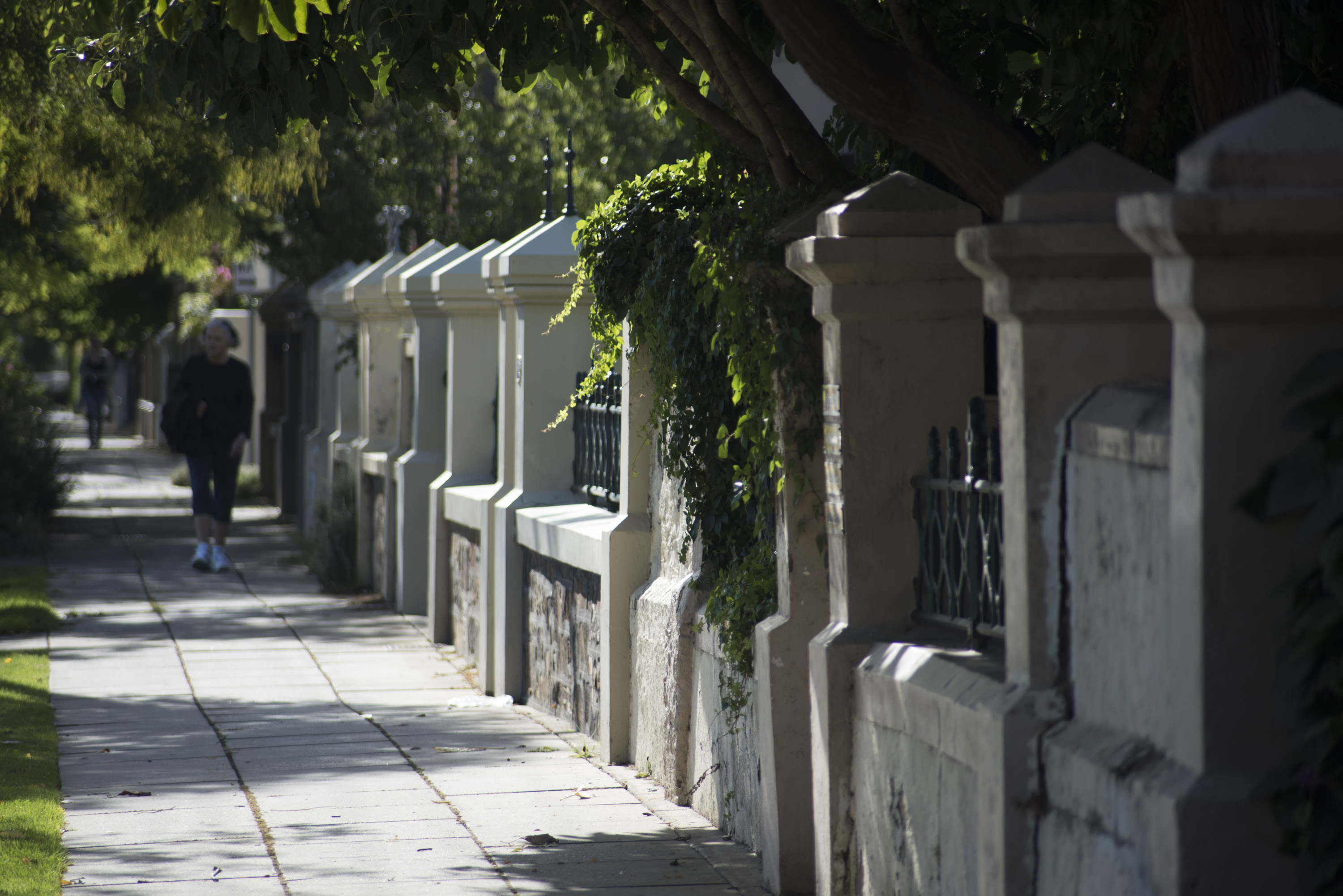 Keywords: adelaide, australia, city, gates, historic, house, leafy, person, shady, sidewalk, street, walking, wall, pavement, trees