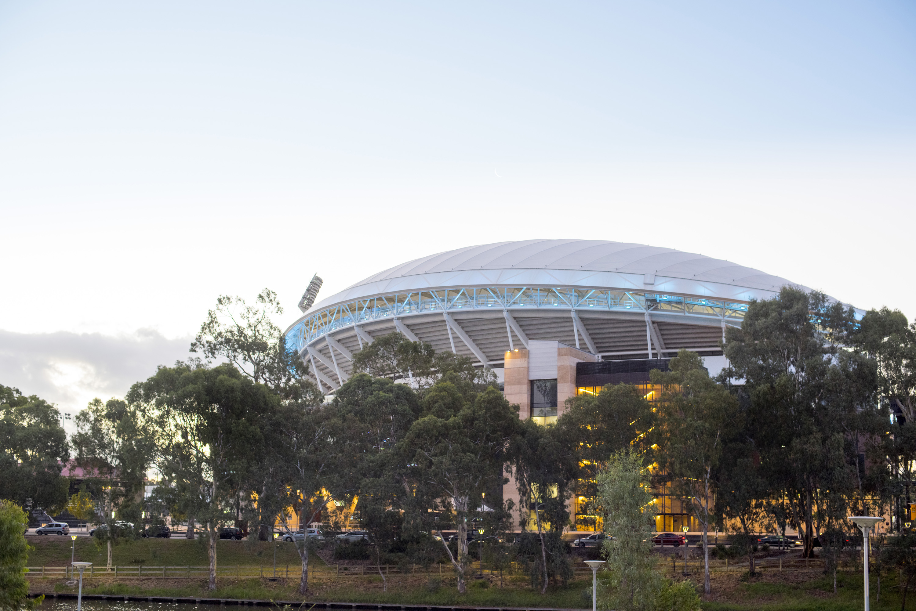 Exterior view of the Adelaide Oval or cricket and sports stadium, South Australia viewed over trees at dusk